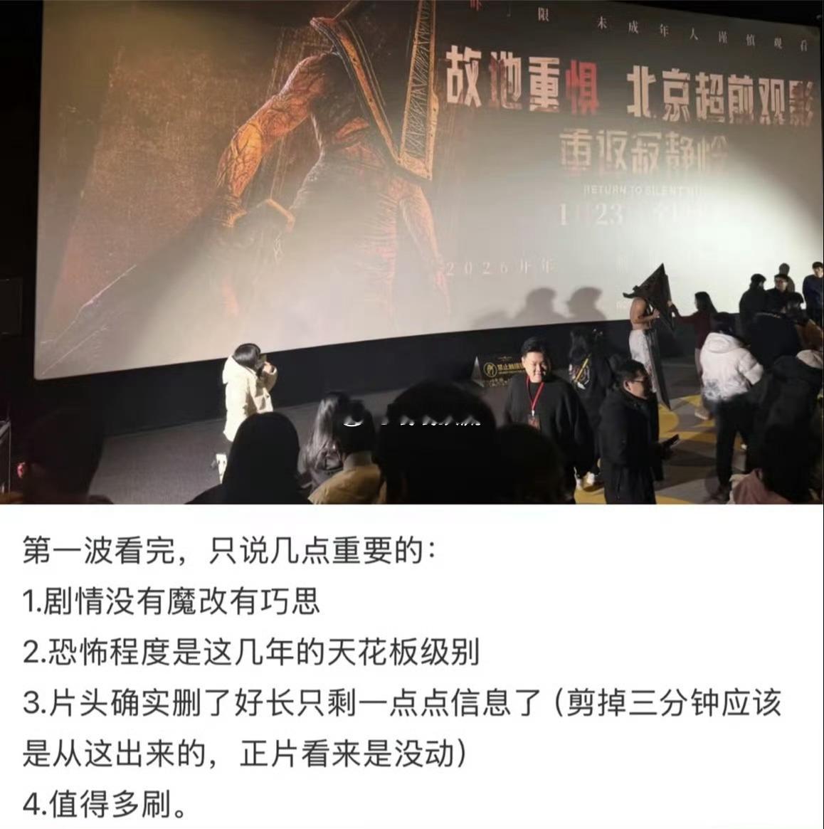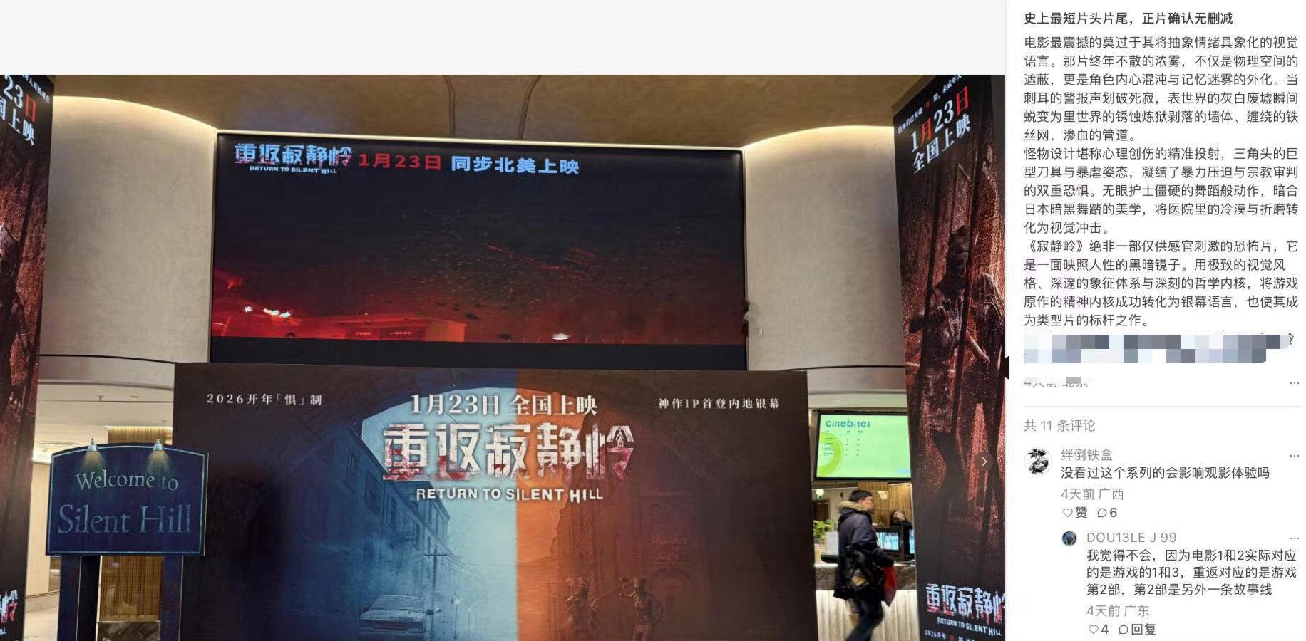 重返寂静岭中外网友对比片头时长 终于等到!《重返寂静岭》1.23全球同步上映,系列首登国内院线,R级硬核质感兼顾引进标准。中外网友花式对比片头时长,恐怖氛围感直接拉满,经典IP的排面,恐怖片爱好者别错过~