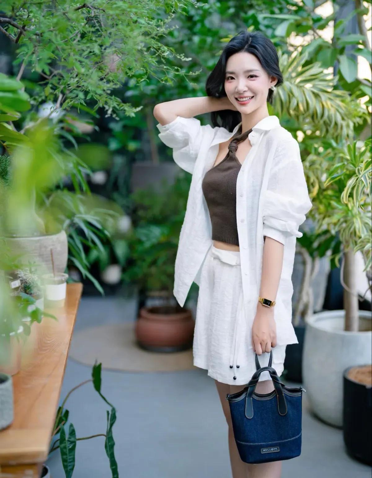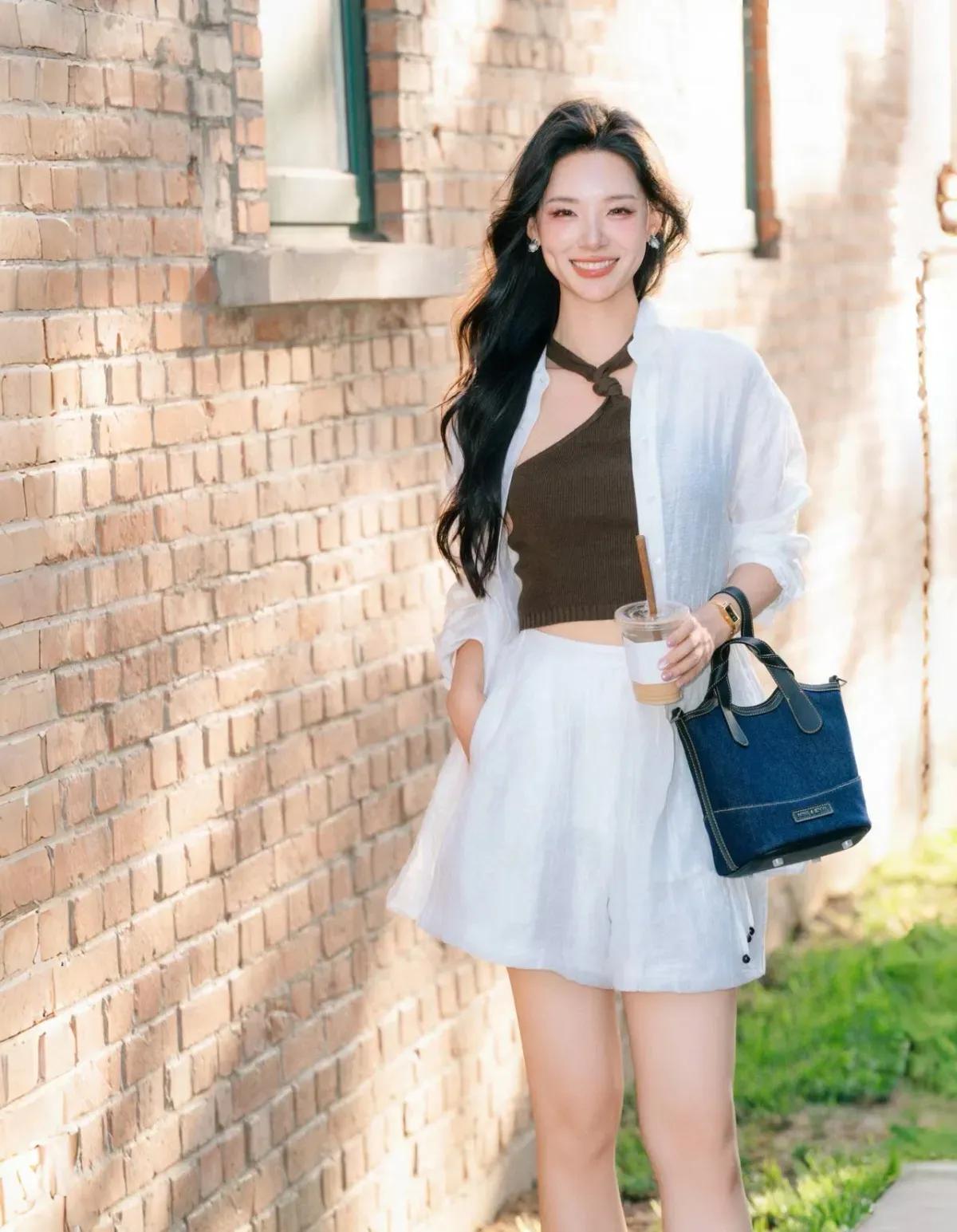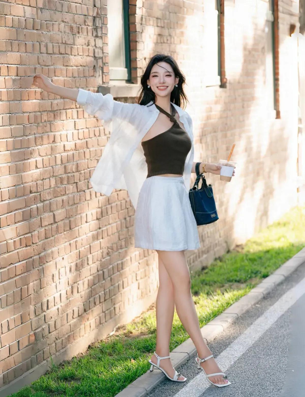 这套穿搭是清新松弛的棕白轻熟风,把随性氛围和精致细节融合。白色衬衫外搭+棕色挂脖吊带,露肤设计注轻熟感,宽松衬衫添松弛感;搭配白色短裙,显清新利落。 搭配藏蓝手提包中和了浅调的柔和,添了点轻奢质感;白色凉鞋呼应整体清新调性,让造型更显协调。充分展现穿着者清新松弛的轻熟魅力。早秋白色穿搭 白色松弛感穿搭 高级感白裙穿搭