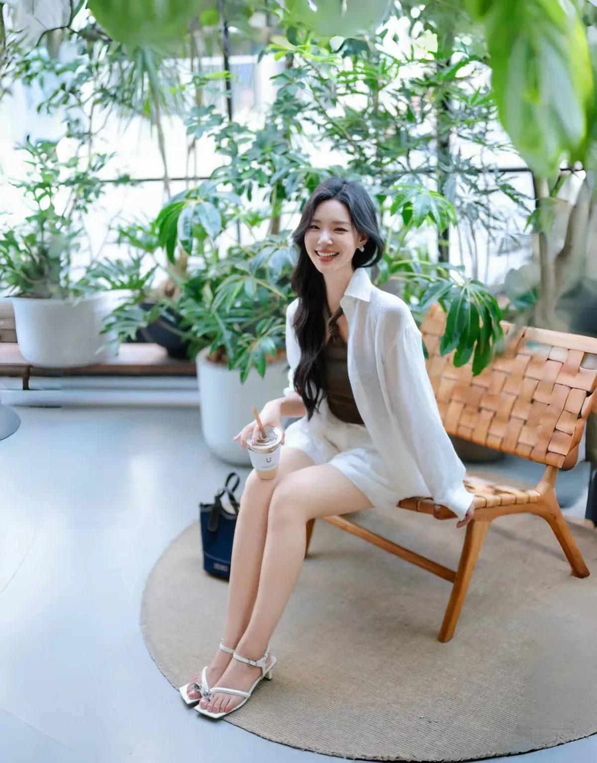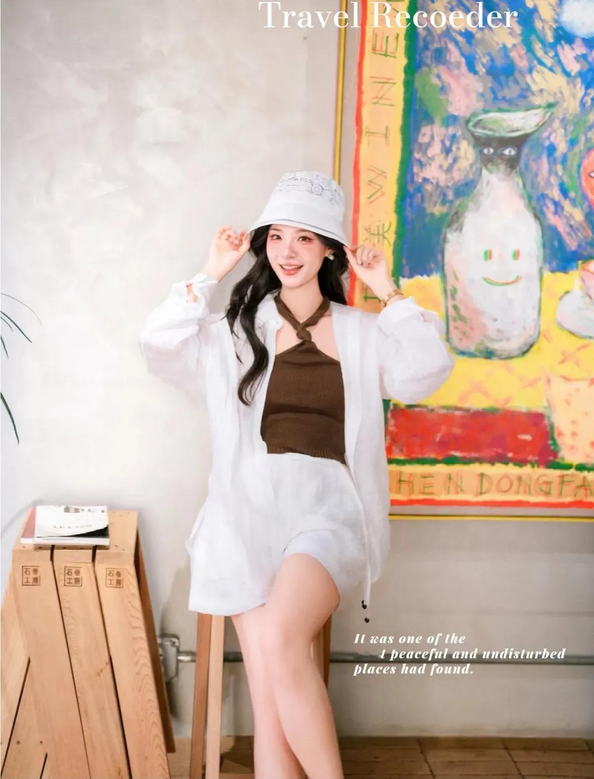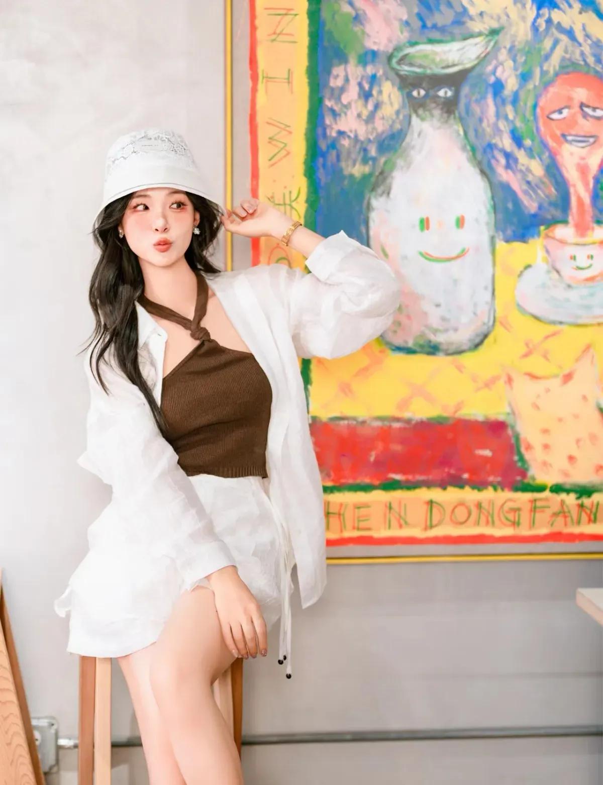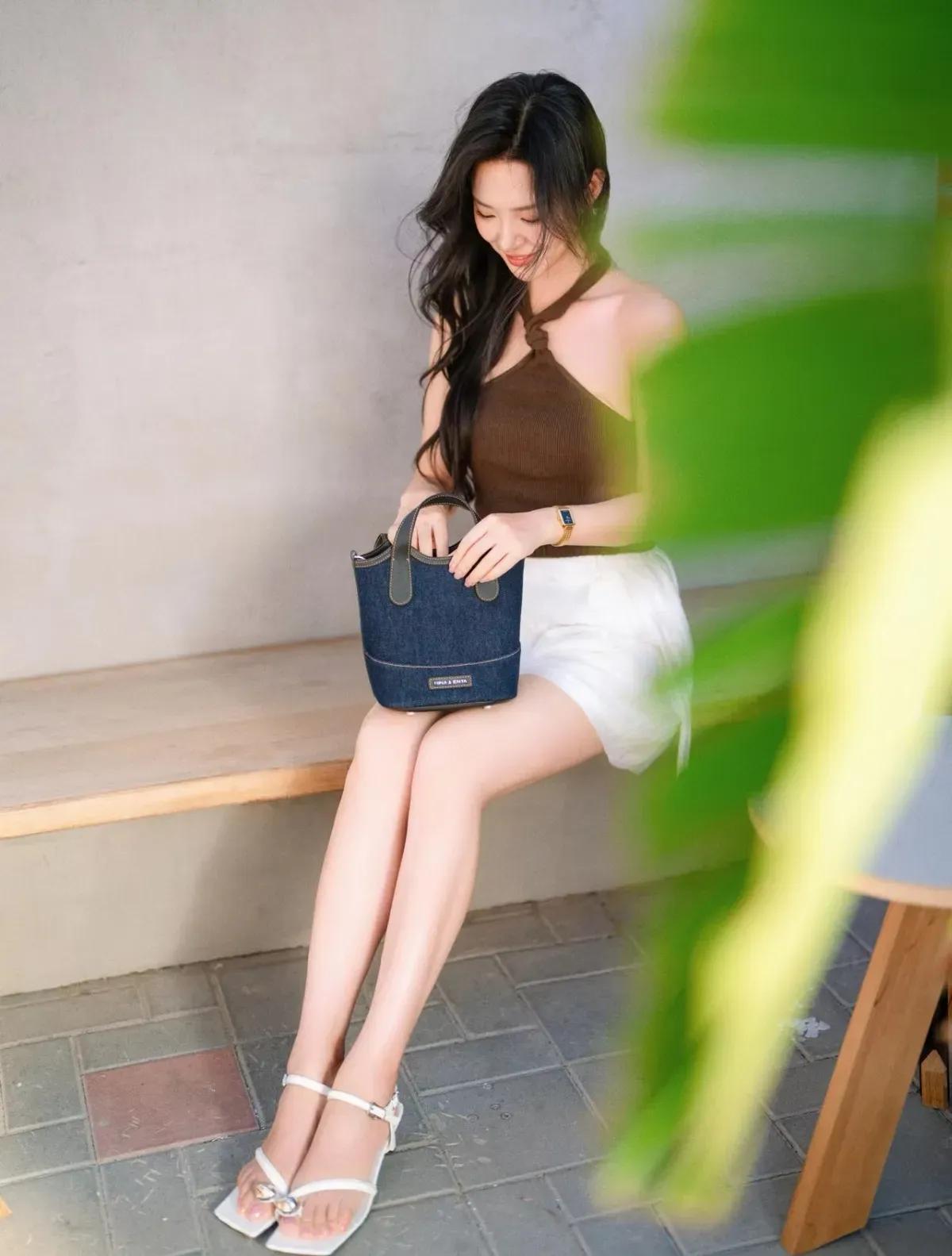 这套穿搭是清新松弛的棕白轻熟风,把随性氛围和精致细节融合。白色衬衫外搭+棕色挂脖吊带,露肤设计注轻熟感,宽松衬衫添松弛感;搭配白色短裙,显清新利落。 搭配藏蓝手提包中和了浅调的柔和,添了点轻奢质感;白色凉鞋呼应整体清新调性,让造型更显协调。充分展现穿着者清新松弛的轻熟魅力。早秋白色穿搭 白色松弛感穿搭 高级感白裙穿搭