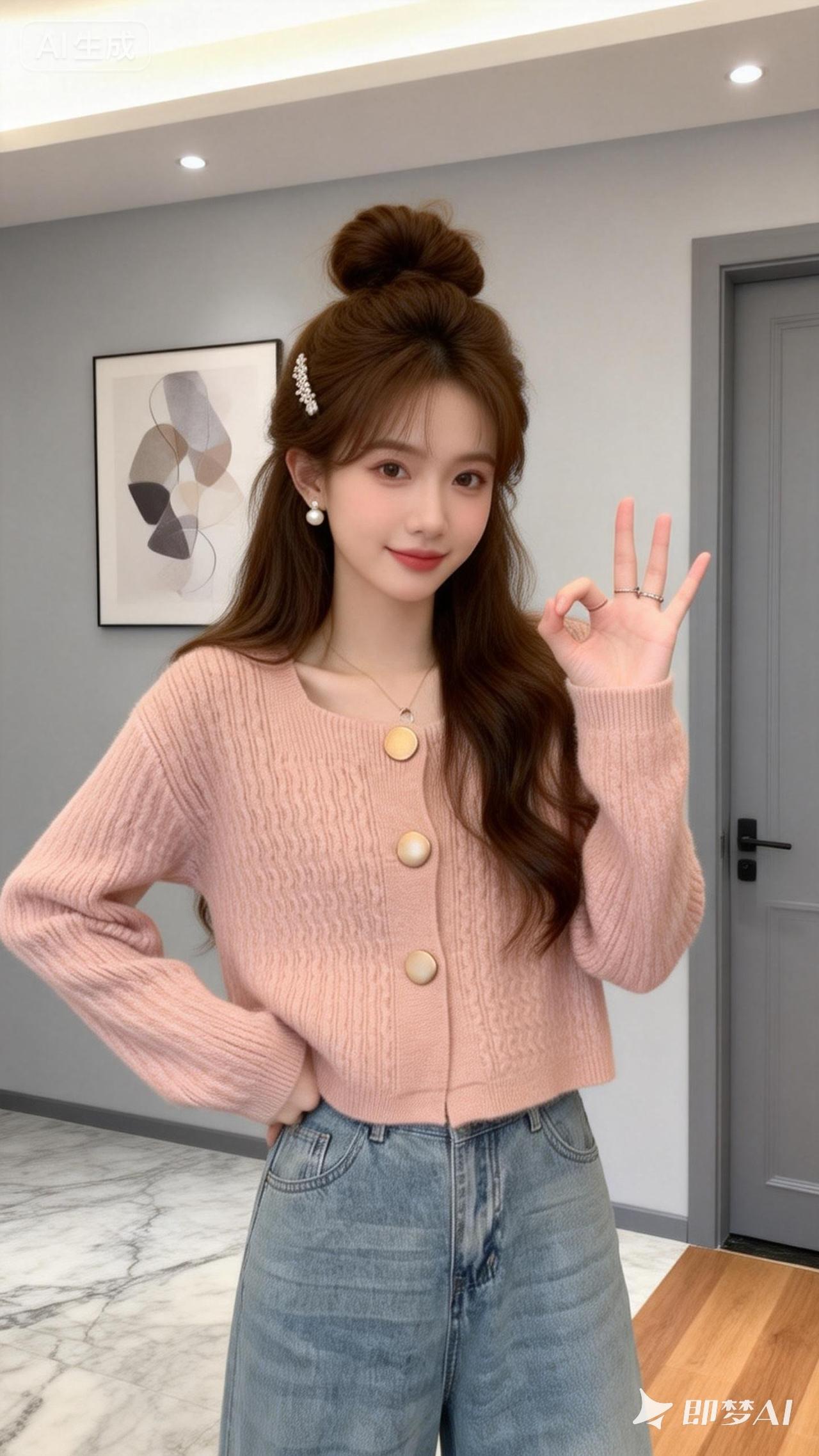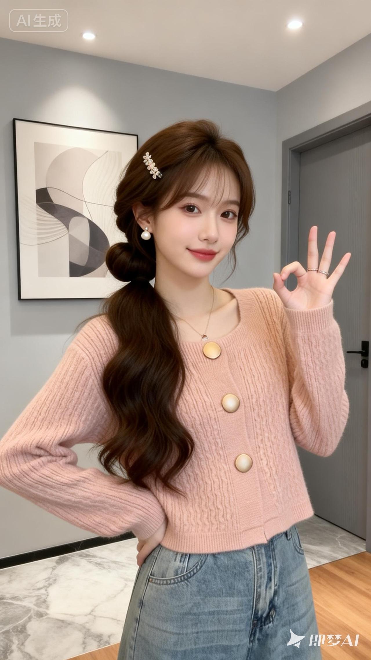 一位23岁左右五官非常精致漂亮的美女,女性为棕色长蓬松温柔盘发,并用带有装饰的发夹固定,发丝有自然的碎发感。