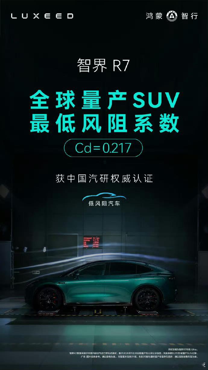 智界R7创全球量产SUV最低风阻纪录智界这波操作,感觉是把风给“削”薄了。R7纯电Ultra版风阻系数居然做到了0.217,直接刷新了全球量产SUV的纪录,比很多轿车还低。据说这一身低趴的溜背造型,加上主动进气格栅、隐藏式门把手这些地方“抠”细节,用了二十多项气动设计。别小看这个数字,实测下来电耗能比行业平均省3个多点。