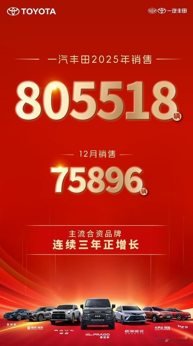 2025年,一汽丰田全年累计销售新车805,518辆,连续第三年保持正向增长,稳居主流合资品牌前列。 2025年度,基于TNGA-K及以上平台的高端车型共销售487,426辆,同比增长12%,占整体销量的61%,标志着品牌高端化战略成效显著、上升势头持续巩固。其中,亚洲龙全年销售126,703辆,同比大幅增长39%;皇冠陆放销量达59,902辆,同比增长14%;RAV4荣放销售204,272辆,同比增长6%。这三款车型共同构筑了一汽丰田在中高端市场的核心竞争优势。
