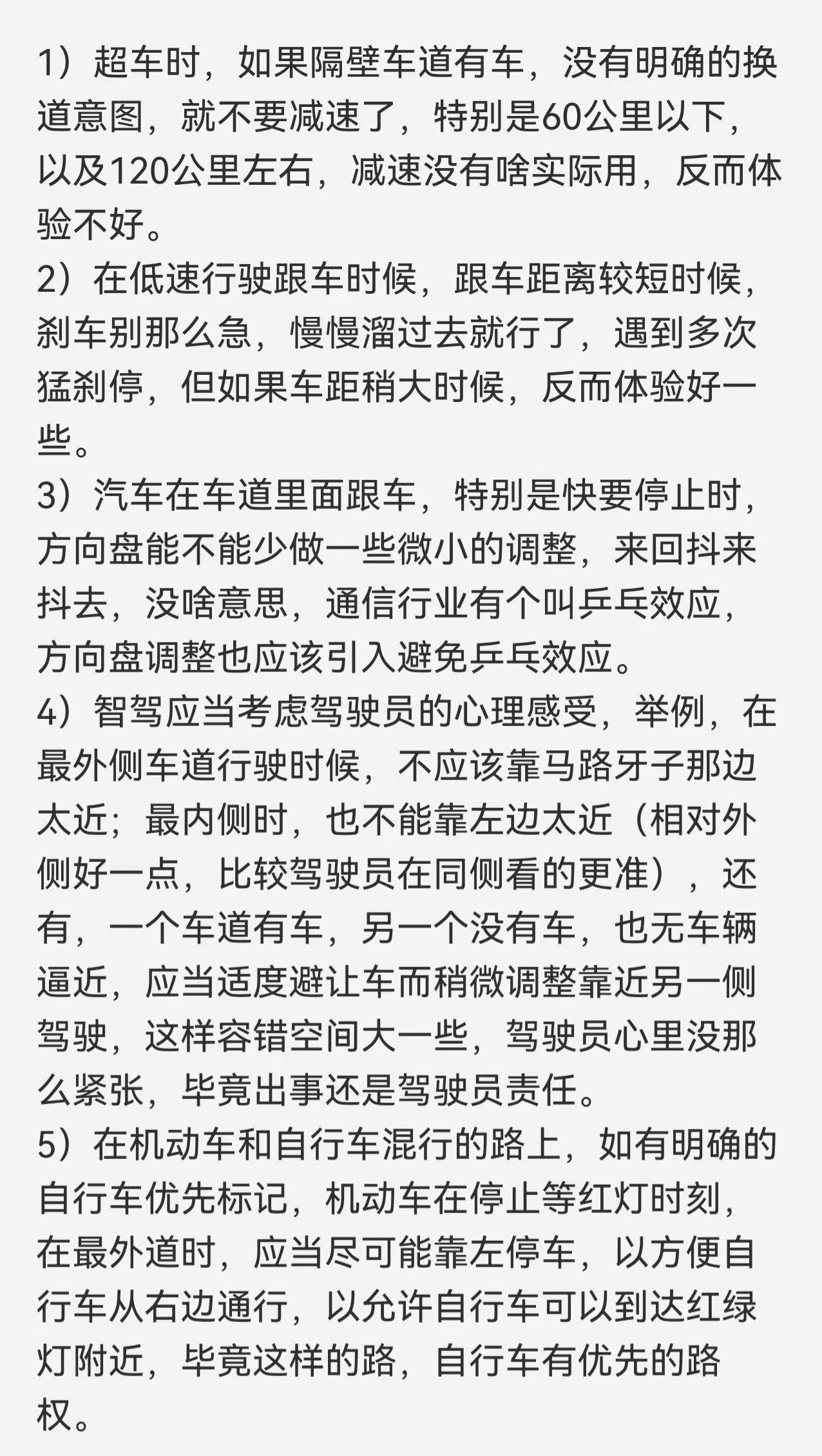 给华为乾崑提提意见,你是很强,但并不完美。1)超车时,如果隔壁车道有车,没有明确的换道意图,就不要减速了,特别是60公里以下以及120公里左右,减速没有啥实际用,反而体验不好。2)在低速行驶跟车时候,跟车距离较短时候刹车别那么急,慢慢溜过去就行了,遇到多次猛刹停,但如果车距稍大时候,反而体验好一些。3)汽车在车道里面跟车,特别是快要停止时方向盘能不能少做一些微小的调整,来回抖来抖去,没啥意思,通信行业有个叫乒乓效应方向盘调整也应该引入避免乒乓效应。4)智驾应当考虑驾驶员的心理感受,举例,在最外侧车道行驶时候,不应该靠马路牙子那边太近;最内侧时,也不能靠左边太近(相对外侧好一点,比较驾驶员在同侧看的更准),还有,一个车道有车,另一个没有车,也无车辆逼近,应当适度避让车而稍微调整靠近另一侧驾驶,这样容错空间大一些,驾驶员心里没那么紧张,毕竟出事还是驾驶员责任。5)在机动车和自行车混行的路上,如有明确的自行车优先标记,机动车在停止等红灯时刻,在最外道时,应当尽可能靠左停车,以方便自行车从右边通行,以允许自行车可以到达红绿灯附近,毕竟这样的路,自行车有优先的路权。华为乾崑 问界