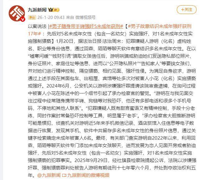 河南南阳,男子通过聊天骗取多名未成年女孩的信任,哄骗她们发送隐私照片和家庭信息。随后,他威胁女孩们听话,否则就会公开她们的私密照片。出于恐惧,女孩们屈从于他的威胁。男子先是在远程对她们实施猥亵,后来又约她们线下见面,用手铐和狗链对她们进行性侵。在短短两年内,6名未成年女孩成为他的受害者,其中包括一名幼女。 2026年1月,主犯游明(化名)因强奸罪、猥亵儿童罪等多项罪名,被判处有期徒刑 17 年 6 个月,正义终于迟到但未缺席。 更让人脊背发凉的是,游明的作案手法并不高明,甚至可以说老套。他在回森、陌陌等平台伪装成 “温柔学长”,用嘘寒问暖加小额红包,就能轻易攻破未成年人的心理防线。 他的 “套路” 清晰得像教科书:先扮演 “灵魂伴侣”,再以 “证明信任” 为由索要私密照片,最后拿出手铐狗链等 “硬家伙” 实施物理与精神双重控制。 最可悲的是,6名受害者中竟无一人在初期选择报警。她们被 “公开裸照” 的威胁吓得魂飞魄散,宁愿默默承受也不敢告诉家人,这恰恰中了犯罪分子的下怀。 为何未成年人会轻易落入这种 “甜蜜陷阱”?答案藏在青春期的心理特点里。这个阶段的孩子渴望被理解,却又对家长封闭心门,给了不法分子可乘之机。 游明精准拿捏了未成年人的心理弱点:既渴望成人世界的认可,又缺乏辨别是非的能力,几句甜言蜜语就能让她们放下警惕,甚至主动暴露隐私。 更可怕的是 “隔空猥亵” 已成为网络性侵的新形式。很多孩子以为只是 “发几张照片”,却不知这已构成犯罪,更不知会成为犯罪分子持续勒索的把柄。 当虚拟威胁变成现实伤害,这些女孩的世界彻底崩塌。游明带着手铐、狗链等刑具与她们见面,这种视觉冲击带来的恐惧,足以摧毁任何一个未成年人的心理防线。 案件暴露的第一个漏洞,是网络平台的监管失职。回森、陌陌等平台虽有未成年人模式,却形同虚设,让游明能轻易接触到目标群体。 更讽刺的是,游明用的都是公开可购买的社交软件,没有任何 “加密通道”。这说明,真正的危险往往藏在最普通的网络空间,而非什么 “暗网”。 第二个漏洞,是家庭性教育的严重缺失。很多家长谈性色变,孩子连基本的隐私保护意识都没有,更别说应对网络性侵的自救能力。 有调查显示,超过七成未成年人从未接受过系统的性教育,对 “什么是性侵”“如何保护自己” 等问题一知半解,这才让游明的骗术屡屡得手。 第三个漏洞,是未成年人心理支持体系的薄弱。当孩子遭受侵害后,找不到安全的倾诉渠道,只能在恐惧中越陷越深,甚至产生 “是自己的错” 的扭曲认知。 游明的落网颇具戏剧性。他以为删除聊天记录就能逍遥法外,却不知检察机关能恢复 5 年的数据,加上出行轨迹、消费记录等铁证,最终将他钉在耻辱柱上。 这起案件也推动了法律的完善。我国刑法明确规定,对未成年人实施性侵,无论是否 “自愿”,都将从重处罚,而游明的 17 年半刑期就是最好的证明。 但法律的事后惩戒,远不如事前预防有效。保护未成年人,需要家庭、学校、社会、网络平台形成 “四位一体” 的防护网,这才是治本之策。 家庭层面,家长要学会 “顺势而为”。与其严防死守孩子上网,不如主动教他们如何保护自己,比如 “三不原则”:不发私密照、不透露家庭信息、不见陌生网友。 学校则应将性教育纳入必修课,用科学、开放的态度讲解身体界限、隐私保护等知识,让孩子从小建立 “身体主权” 意识,懂得对不当要求说 “不”。 网络平台更需承担主体责任。要升级实名认证系统,对未成年人账号进行严格管控,同时建立快速举报通道,对可疑账号及时封禁,从源头上切断侵害途径。 社会层面,应建立未成年人保护热线和心理援助平台,让遭受侵害的孩子能第一时间获得专业帮助,而不是独自面对恐惧。 更重要的是,要改变 “受害者有罪论” 的社会心态。当孩子鼓起勇气说出遭遇时,得到的应是同情和帮助,而非指责和质疑,这才能让更多受害者敢于站出来。 这起案件给所有家长敲响了警钟:网络不是法外之地,更不是未成年人的 “安全区”。你以为的 “小聊天”,可能藏着摧毁孩子一生的魔鬼。 同时也提醒未成年人:真正的朋友不会索要私密照片,真正的关爱不会以威胁为前提。遇到任何让你不舒服的要求,第一反应应该是拒绝并告诉信任的人。 游明的下场证明,正义或许会迟到,但绝不会缺席。但对受害者而言,最好的正义是从未遭受伤害。这需要我们每个人都行动起来,守护好未成年人的网络空间。 最后,我想问问大家:你认为保护未成年人免受网络性侵,最需要解决的问题是什么?是家庭性教育的缺失,还是网络平台的监管不力?欢迎在评论区留下你的观点,一起为孩子们撑起一片安全的天空。