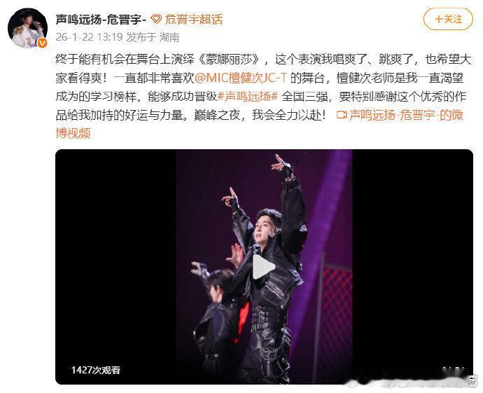 檀健次给危晋宇冠军夜加油 从演绎作品到收获偶像鼓励!危晋宇的音乐之路太励志,檀健次暖心加油为其冠军夜加持,期待拿下荣耀宝座~声鸣远扬