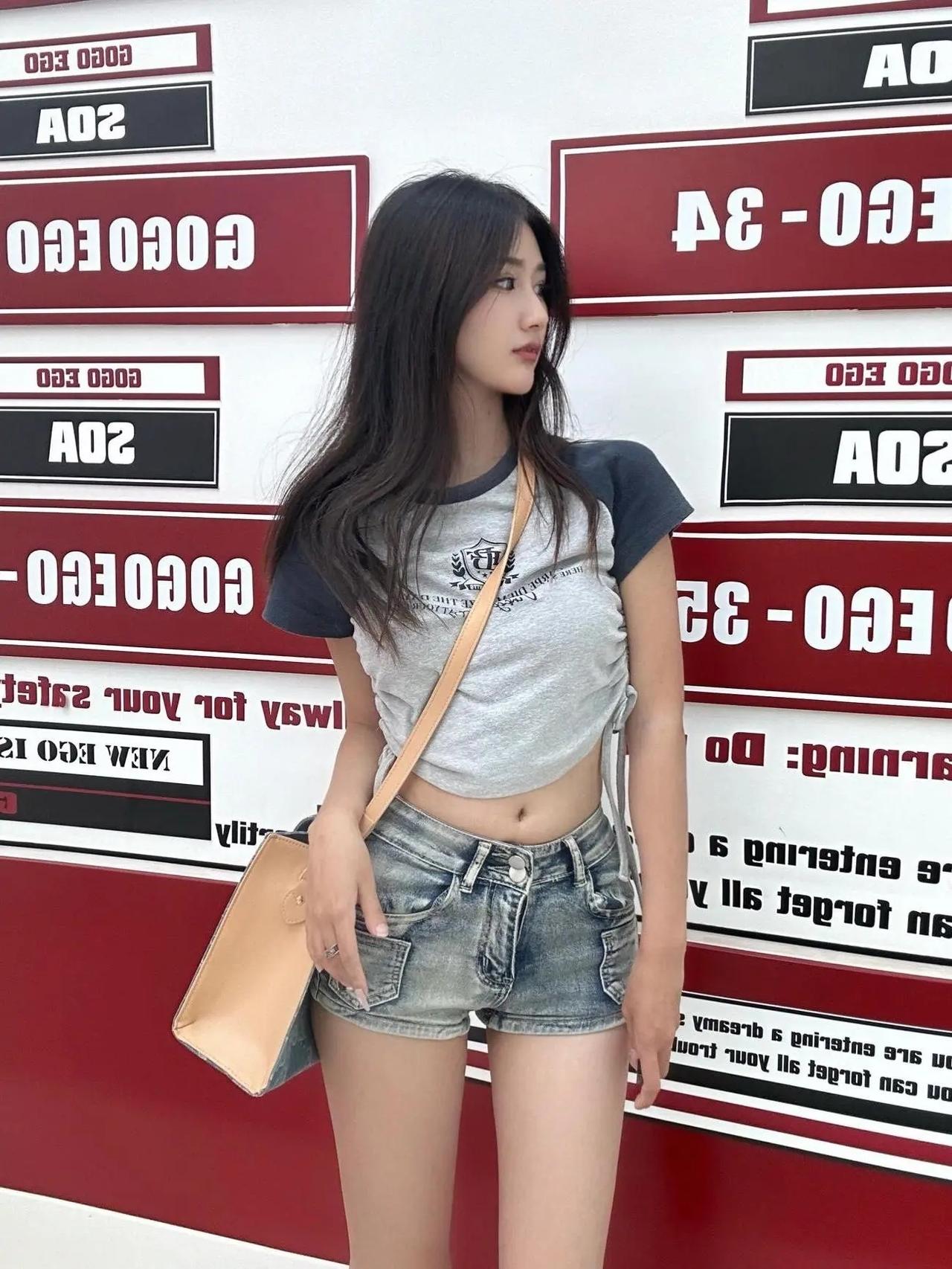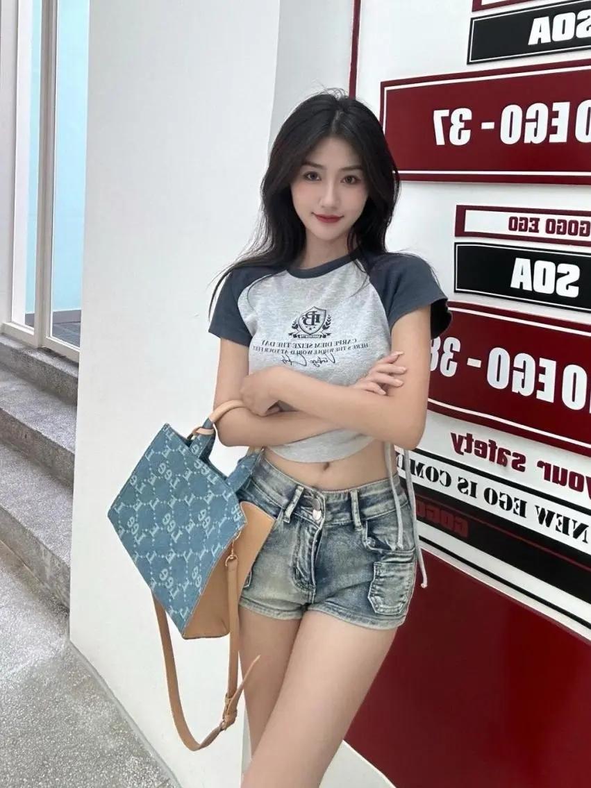🩹 复古插肩袖短T配牛仔热裤,在红黑撞色的潮酷背景里,把美式辣妹的松弛感拉满。