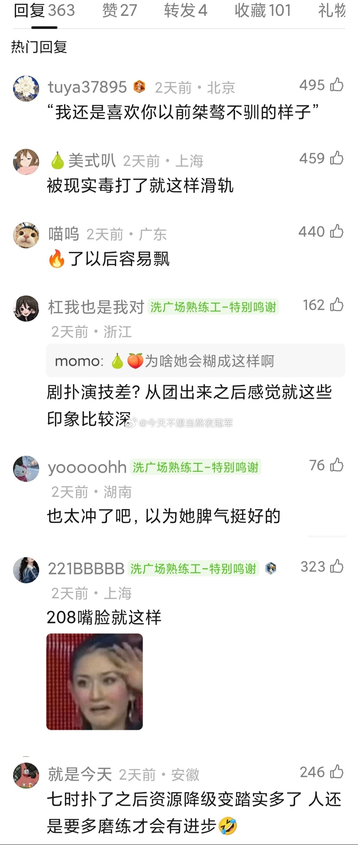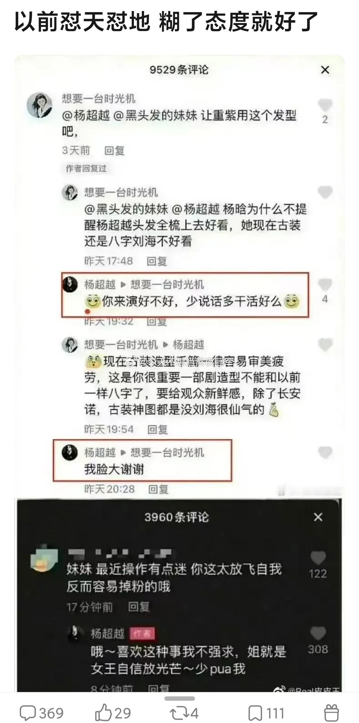 网友在讨怼粉的明星,我还是第一次看到这个哎,前几年怼天怼地的杨超越🆚现在的杨超越。们内娱果然只有红人才有资格真性情