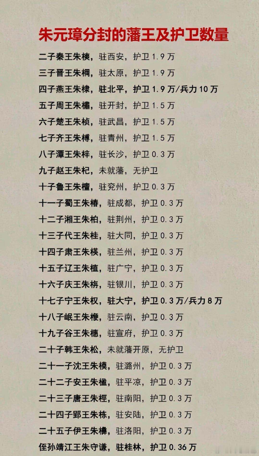 历史 朱元璋分封藩王制度有多奇葩?明太祖朱元璋,驱逐蒙古,重建华夏王朝,恢复汉语、汉字、汉姓,功在千秋。然而,他也做了一件奇葩事情,将25个儿子还有一个侄孙分封在各地。不仅是分封,每个藩王拥有几千顷到几万评良田,王府还拥有护卫。秦王、晋王、燕王护卫1.9万人,周王、楚杨、齐王护卫1.5万人。其他儿子也有3000人护卫。历史上周朝分封,形成上百个诸侯。西汉分封,导致七国之乱。西晋分封,导致八王之乱。明朝20多个藩王拥有重兵,成为明朝的隐患。朱元璋死后,朱棣起兵造反,推翻建文帝,夺了江山。朱棣当皇帝后,限制藩王拥兵。明朝历史上,还出现一次宁王叛乱。藩王的子孙,也要分封爵位。到明朝后期,几十万明朝宗室,成了财政沉重负担。明朝的藩王不准参与政治,拥有的力量不能为明朝出力,却拖垮了明朝的江山。明末农民起义,李自成、张献忠屠杀藩王。清朝入关,又大量屠杀明朝宗室。朱元璋的几十万子孙,只有少数逃过屠杀。历史