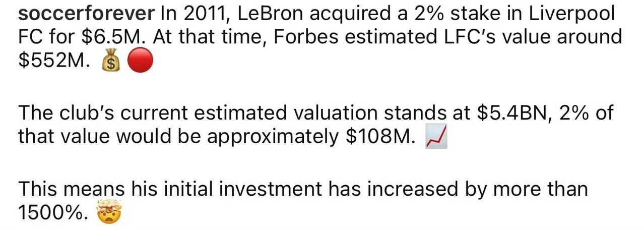 15年时间650万美金变1.08亿美金,詹姆斯净赚1个亿美金…… 詹姆斯这投资眼光直逼乔丹! 2011年前后的利物浦足球俱乐部联赛成绩连续几个赛季不理想,市值处于低谷期。当时《福布斯》给利物浦估值为5.52亿美元。詹姆斯抓住机会以650万美元收购了利物浦俱乐部2%的股份。 后来,利物浦请来了渣叔,投入了大量资金引进超级球星后,利物浦重新成为冠军球队……目前,利物浦估值猛涨到54亿美元,其2%的价值约为1.08亿美元。这意味着詹姆斯的初始投资增长了超过15倍约1亿美金……