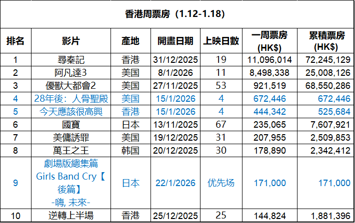 2026年第3周香港票房 :1.《寻秦记》三连冠,累计票房7224万排名2025年度第2,香港影史第34;2.《阿凡达3》累计票房破2500万,《疯狂动物城2》累计票房6855万排名香港影史第37;3.《28年后2:人骨圣殿》在新片中表现最佳。(数据:香港贸发局)