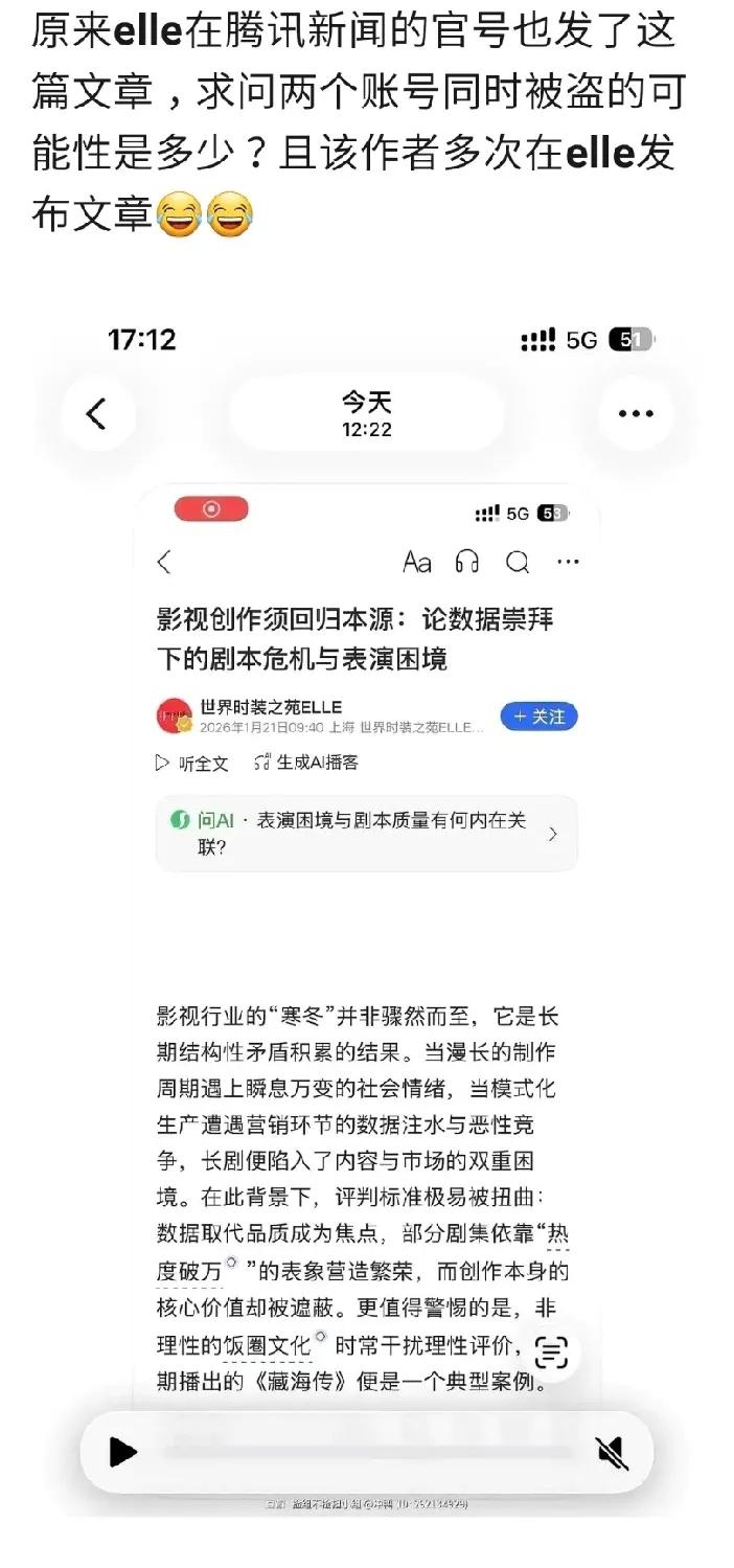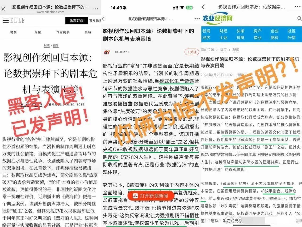 黑客入侵官网只为了发一篇影评?《ELLE》网站编辑部发布声明称有外部账号通过非授权技术手段访问网站后台,并违规发布了文章。 ELLE不发声明还没有多少人注意到,一发就勾起了网友们的好奇心了,这篇名为《影视创作须回归本源:论数据崇拜下的剧本危机与表演困境》的影评到底说了啥,让Elle不得不公关? 网友们一看觉得文笔好像还挺有新闻水准的,《**传》央视收视率低这是事实吧?(图4) 该影评的署名作者在Elle官网发布过不少文章。既然是被盗号,那Elle快报警吧!