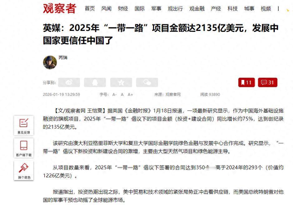 2135 亿!中国 "一带一路" 暴涨 75%,特朗普围堵越狠,世界越靠中国 谁能想到,西方忙着唱衰中国经济时,“一带一路” 直接甩出王炸!2025 年新增项目投资暴涨 75%,总规模突破 2135 亿美元,这份来自格里菲斯大学和上海绿色金融与发展中心的数据,让英媒都直呼意外。 一边是特朗普政府满世界 “抢资源”:对巴拿马施压逼停中企基建合作,用军事威胁拿捏委内瑞拉能源,跟盟友为贸易逆差吵得不可开交,连 “保护费” 都要翻倍收。可这种短视操作,只换来了暂时的账面利益,却彻底耗光了美国的信誉 —— 超级大国连规则都不讲,盟友都要薅羊毛,谁还敢真心追随? 另一边中国闷声干大事:2135 亿不是简单撒钱,而是精准布局绿色能源、数字矿产和高科技产业链。现在不少发展中国家的电力系统、通信网络都离不开中国技术,核心矿产开发也有中国资本加持,这种结构性共生,可比美国的航母威慑管用多了。 特朗普搞 “门罗主义 2.0” 想控制拉美,却解决不了巴拿马运河扩建的资金技术难题;制裁委内瑞拉,却拿不出中国这样廉价稳定的工业制成品。对急需发展的国家来说,美国的威胁换不来温饱,中国的投资才是实实在在的机遇。 更关键的是,这波投资很多绕开了美元结算,用人民币或本币互换。这才是戳中美国要害的关键 —— 没法靠印钞收割全球,庞大的债务危机就没了转嫁出口。特朗普越搞单边制裁、破坏供应链,各国越需要稳定的替代方案,而能提供全产业链支持和稳定政策的,只有中国。 美国选了 “掠夺流”,靠压榨资源维持优势;中国走 “运营流”,靠扩大合作做大蛋糕。现在看,特朗普越围堵,中国的朋友圈越广。2135 亿的暴涨,已经是全球资金用脚投票的结果:发展才是硬道理,合作共赢永远比强取豪夺更有生命力!