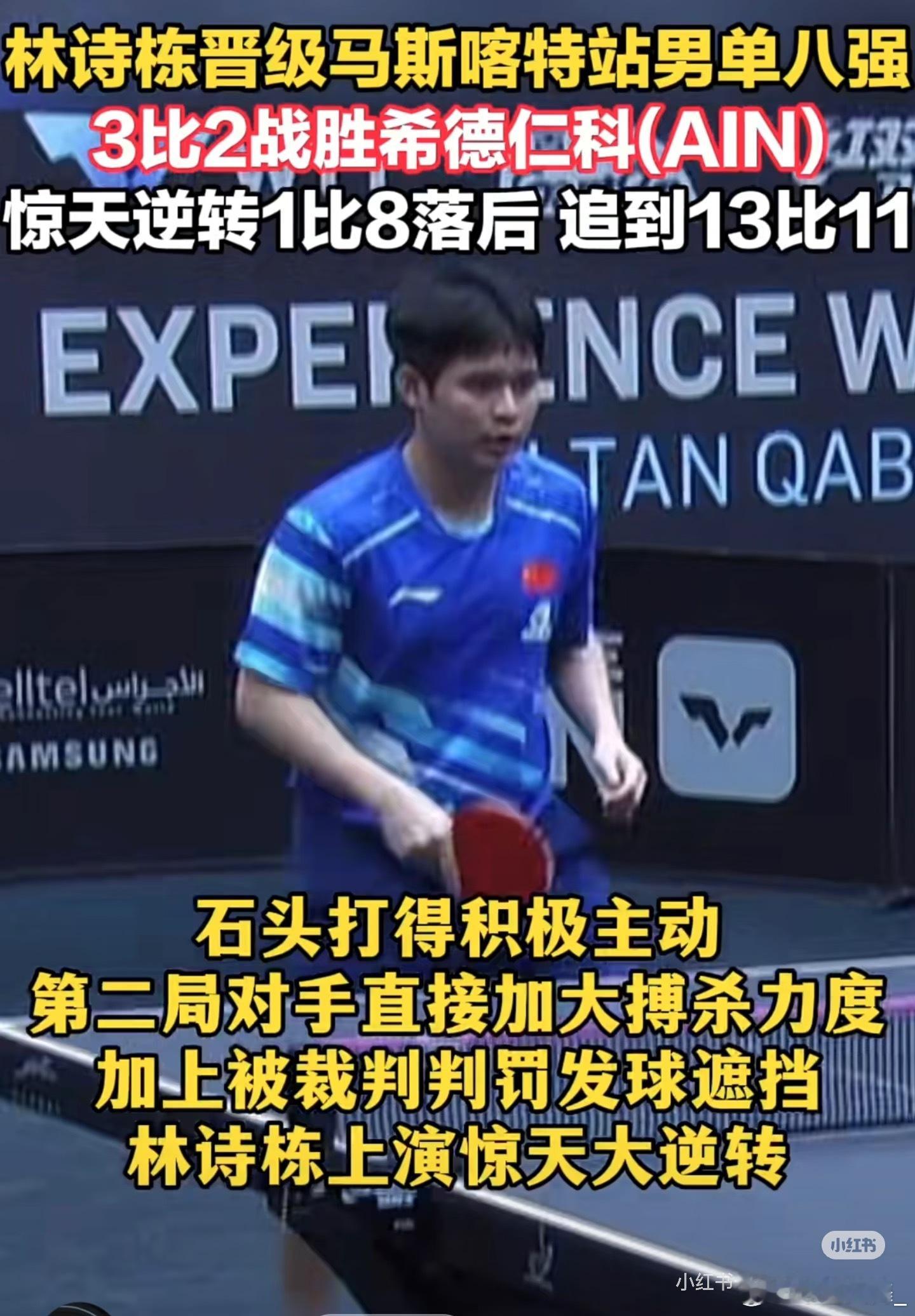 林诗栋3比2希德仁科林诗栋因遮挡被罚2分2026年1月22日,乒乓球WTT马斯喀特常规赛上演焦点对决,由国乒主力林诗栋迎接俄罗斯个人中立选手、新科大运会男单金牌得主西多仁科的冲击,结果林诗栋大比分3-2艰难胜出、单局一度小比分1-8落后翻盘,由此而锁定男单8强席位继续冲击冠军!期间由于遮挡还被罚2分,真的是险胜啊!