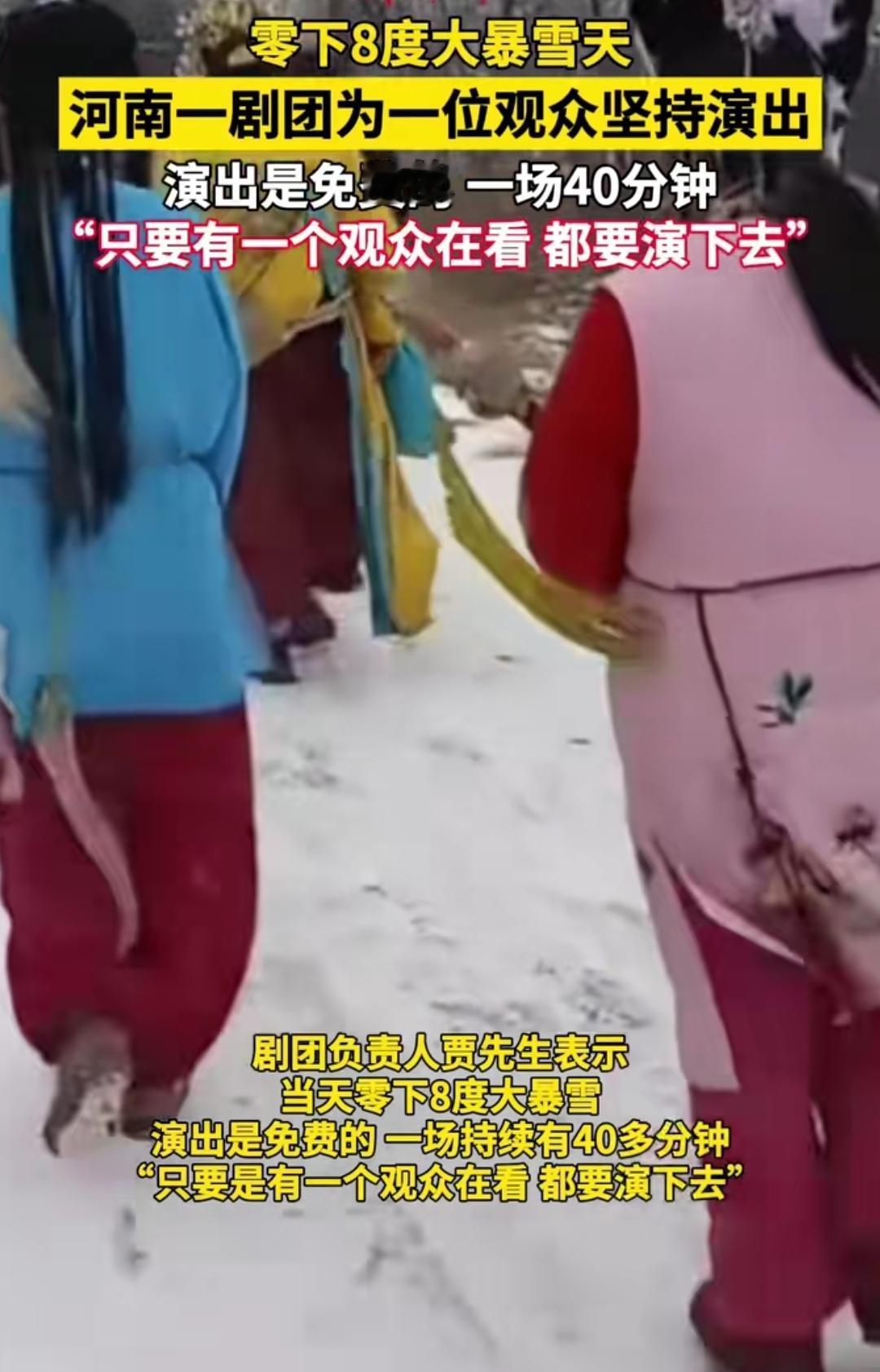 你见过雪裹着的戏台吗?河南那场大暴雪,零下8度冻得人喘口气都发颤,简易戏台上却亮着光——台下就一个裹成熊的大爷,棉帽上积着雪,手揣在袖筒里,眼睛直勾勾钉在台上。台上一群穿戏服的演员刚开嗓,水袖扫过飘着的雪粒子,像把冷风都裹进了戏里。 没人催场也没人散,大爷蹲在雪地里没挪窝,演员们的脸冻得通红,唱腔却没半点含糊。40分钟的戏,身段、念白、锣鼓点,一样都没落。剧团负责人后来只说句“有一个观众就得演”,这话砸在雪地里,脆得像刚结的冰碴子。 网友刷到这幕都静了:有人说这是老行当的死规矩,有人心疼演员冻得直搓手。这雪天里的一场戏,到底是艺人们太“轴”,还是这一演一看里,藏着咱们丢了好久的“真”?