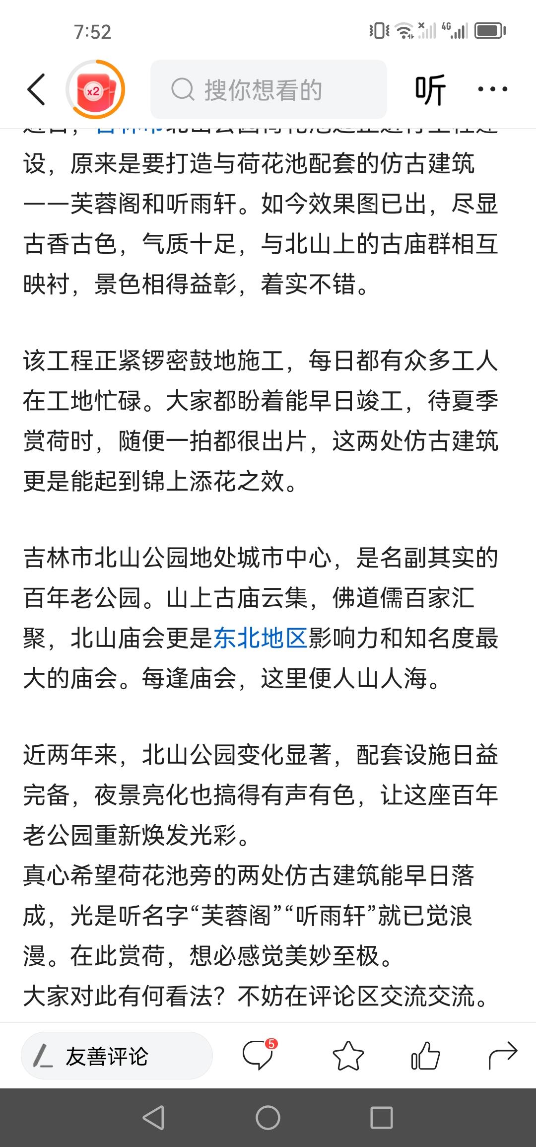 吉林市北山公园的仿古建筑已然落成,美到令人惊叹! 吉林市北山公园的两处仿古建筑现已完工,雕梁画栋、飞檐古瓦,满是古色古香的韵味。它们位于北山荷花池畔,分别名为听雨轩和芙蓉阁,光是名字就十分文雅。这两处建筑背山面水,风水绝佳,待到夏日荷花盛开,定会呈现美轮美奂之景。建成后的建筑与效果图几乎毫无二致。 这两处建筑整个冬天都在施工,建筑师傅们着实辛苦,他们也为吉林文旅事业贡献了力量。近年来,公园持续升级改造基础设施,不断提升品质,变得愈发美丽。尤其是极海铁路带状公园的开通,让北山公园更是锦上添花,人气日益旺盛。 这座有着几百年历史的老公园,坐落于城市中心。山上古庙众多,历史遗迹随处可见。每年的庙会是吉林地区最盛大的活动,吸引着四面八方的游客前来。它在东北地区颇具知名度和影响力。 其实,我个人最爱看北山的荷花池。盛夏时节,那景色美不胜收,真正是“接天莲叶无穷碧,映日荷花别样红”。再加上这两处漂亮的仿古建筑,宛如一幅绝美画卷。 大家对此有何看法?不妨在评论区交流。 图片来源于网络,如有侵权请告知删除。