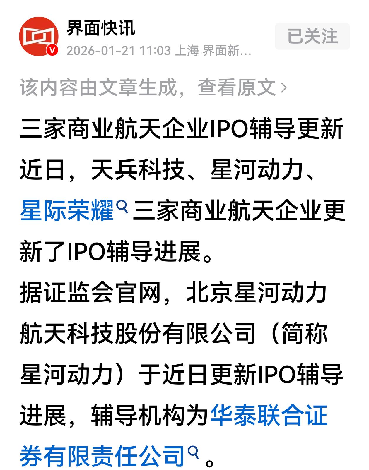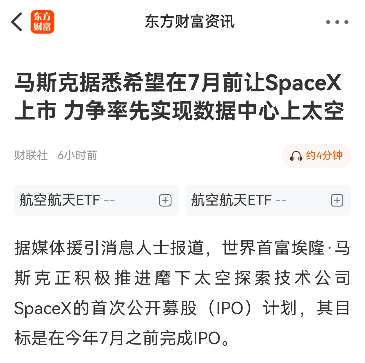 关于商业航天, 几则大消息不要忽视! 商业航天上央视了,天上星、陆上箭、海上船,商业航天如何“链”动未来。多家航天公司进入密集工作状态,商业航天正以全所未有的速度和广度,释放出强劲的“链”动效应。企业层面的情景反映行业的实际状况,不得不承认商业航天的高景气周期已经开启! 三家商业航天企业IPO辅导更新,涉及天兵科技、星河动力、星际荣耀,完成辅导后的目标当然是上市了,前有蓝箭航天冲击IPO已获受理,看来今年是商业航天上市的大年。资本流向的地方,往往就是市场看好的地方。去年GPU几条龙上市了,这些公司的投资方、供应商也被激活了,A股同类股寒王、海光信息也涨得你不敢相信。 SpaceX 离资本市越来越近了,马斯克希望其在7月前上市。不要小看这个事件,这些头部企业的一举一动往往牵动A股,届时就会出现“中国的SpaceX”,如同GPU赛道的“中国英伟达”,这些标的容易受到资金的追捧,其产业链企业也会获得好的成长机会,同样会受到市场关注。 商业航天有了一波行情,涉及题材股过度炒作引起关注,市场出现一些降温现象,这对市场后势是好事。管理层维护市场稳中向好的态势,倡导价值投资,市场基本面向好,大盘上行趋势不会改变。至于个股还是业绩+科技,你看去年业绩暴涨的CPO标的,实质硬科技的GPU,涨幅都是很大的,没有谁说他们不该涨。