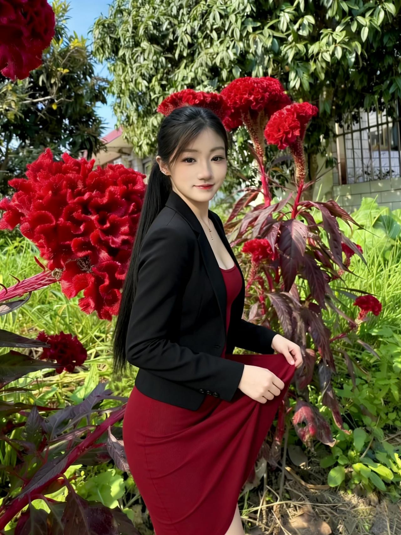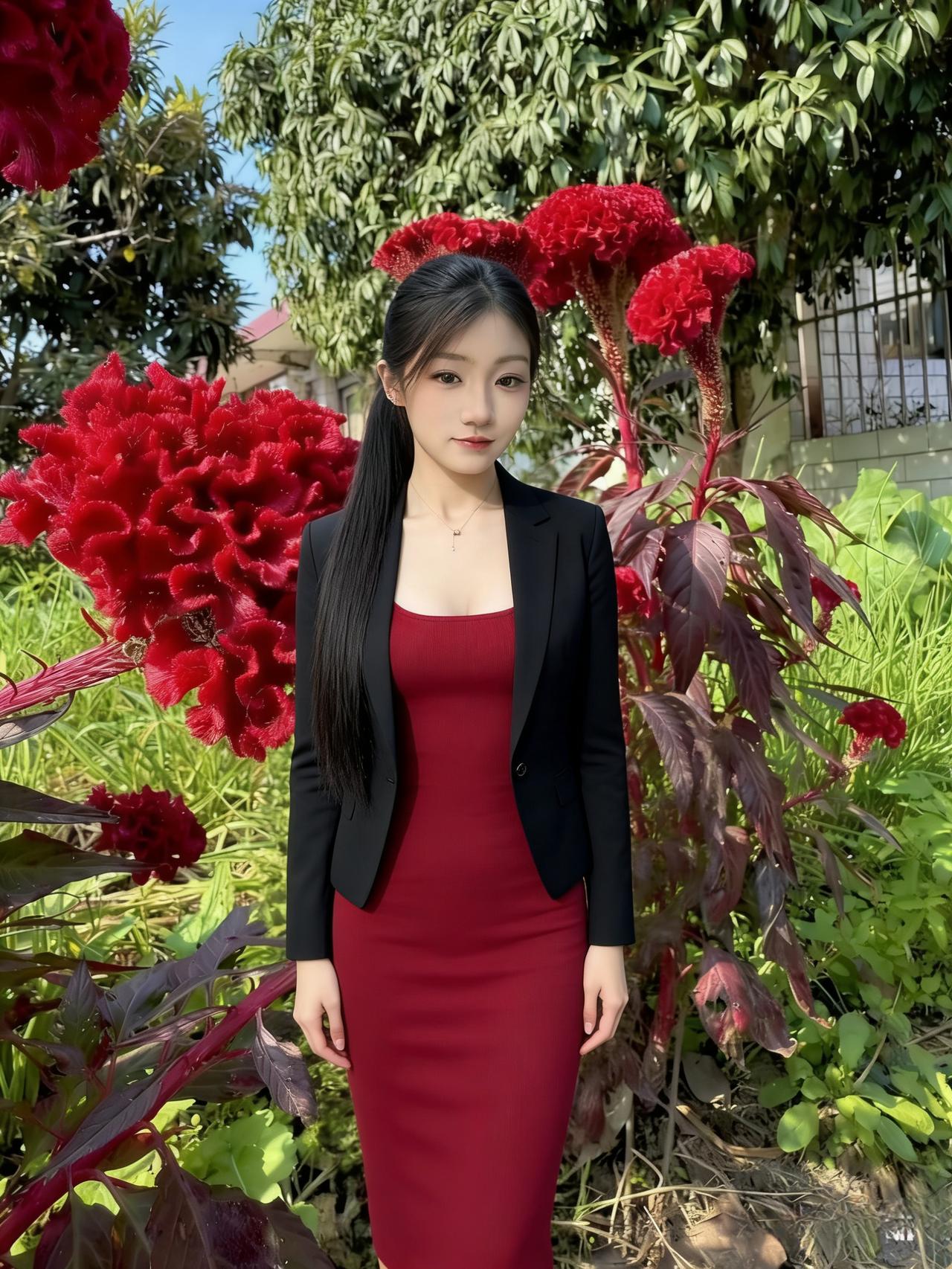 不必说话,鸡冠花替她发声 红裙是最热烈的宣言 她站在花间 大自然为她们的女王加冕 ~ 鸡冠花的绒面吸附着光 草叶在脚下编织着绿毯 她的瞳孔里 藏着整座温柔的春天 ~ 风穿过花丛时 所有的花都向她倾斜 像一群虔诚的信徒 在朝拜自己的神明
