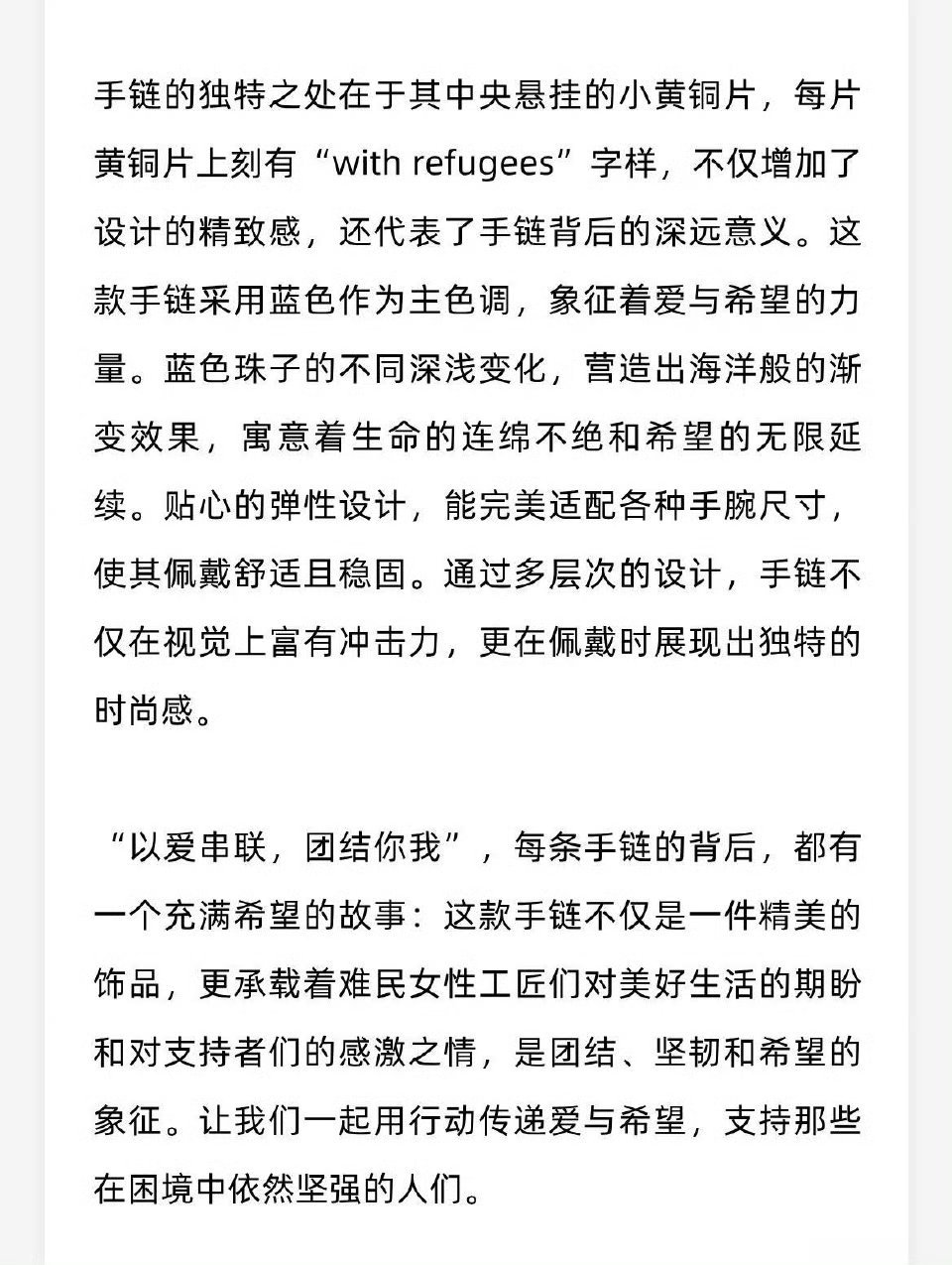 文淇的蓝色手链文淇真的好棒,戴着的蓝色手链是由难民女性工匠亲生制作的,好棒的小女
