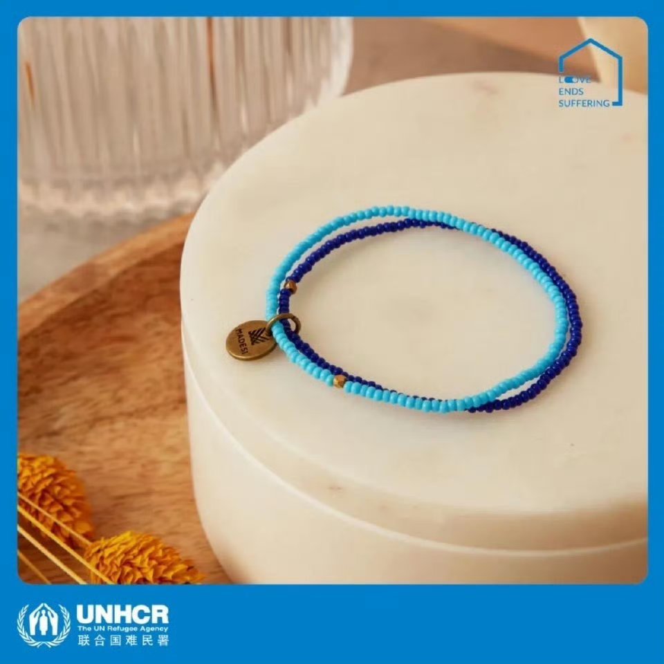 文淇的蓝色手链文淇真的好棒,戴着的蓝色手链是由难民女性工匠亲生制作的,好棒的小女孩!文淇手链由难民女性工匠亲手制作