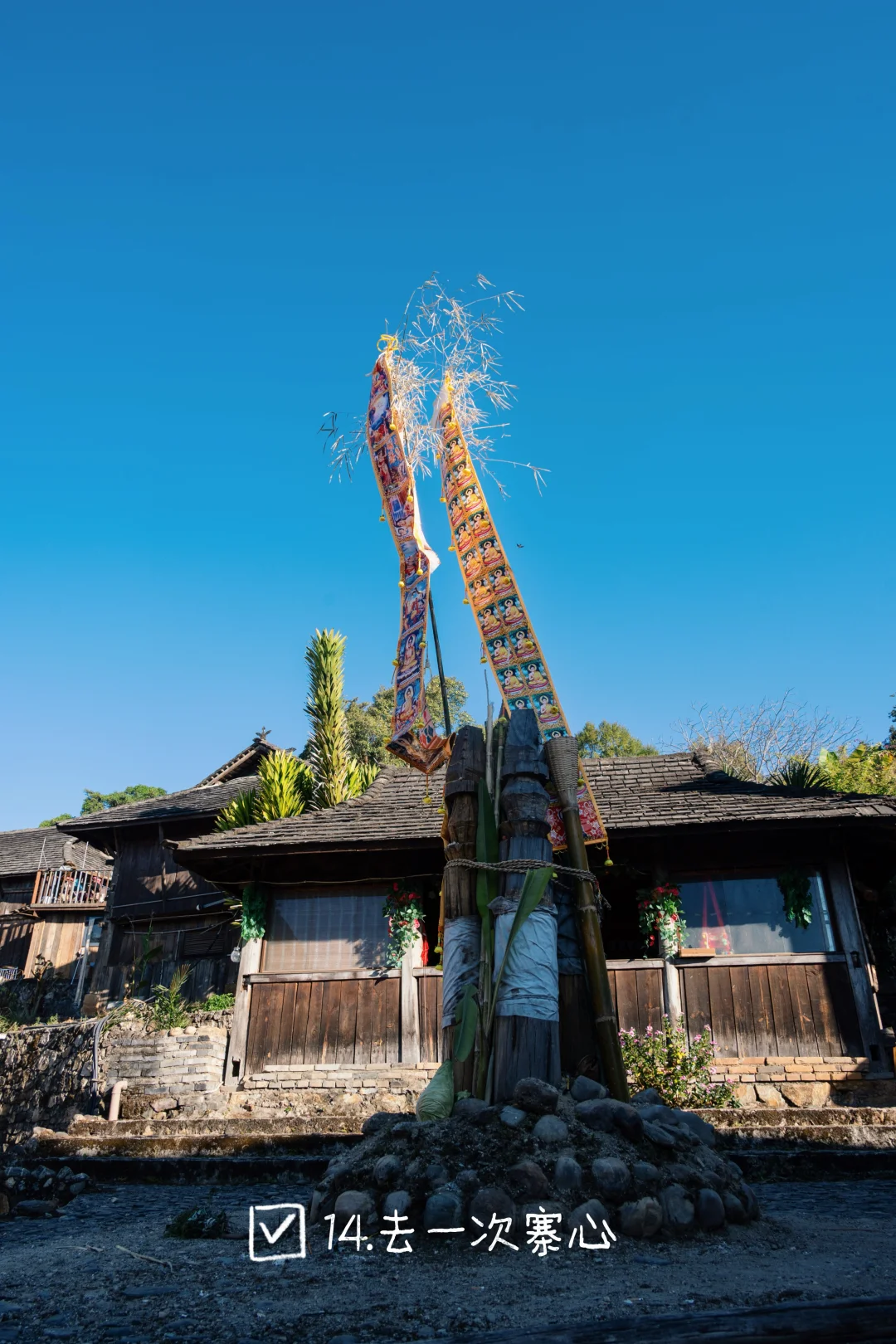 14.去一次寨心: 寨心坐落于村寨正中,或以石为基,或以木为标,是村民心中神圣的寨神象征。