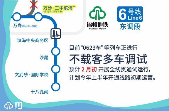 预计2月初开始试运行!福州地铁又一新线路 【🥭🥦预计2月初贯通试运行!福州地铁6号线东调段新进展】 ✨福州地铁6号线东调段于12月20日结束“天窗期”施工,近期正开展万寿站至十八孔闸站不载客多车调试,“0609车”“0617车”及新车“0623车”等参与调试; 🌟预计2月初将开展全线贯通空载试运行“跑图”的第一阶段,[机智]计划今年上半年开通线路初期运营。 ——————————————————— ——🚇 6号线东调段(东段调整段): 是《福州城市轨道交通第二期规划建设规划调整》项目之一,该线路起于万寿站(不含)、止于十八孔闸站线路长约5.549Km,设站5座车站,分别为:万沙•三中滨海站未来🔄规划线路、滨海中央商务区站🔄滨海快线、沙尾站、文武砂•国际学校站及十八孔闸站。是连接福州市中心与长乐滨海新城的核心交通干线。 ——————————————————— ◉ ❗️本博为爱好者自制,站名仅为工程名,不一定为实际运营开通后使用,本人非福州地铁官方,仅供参考❗️实际准确信息请关注@福州地铁 官方微博、公众号、视频号或抖音号福州地铁 轨道交通 地铁 城市交通规划 福州 交通便利