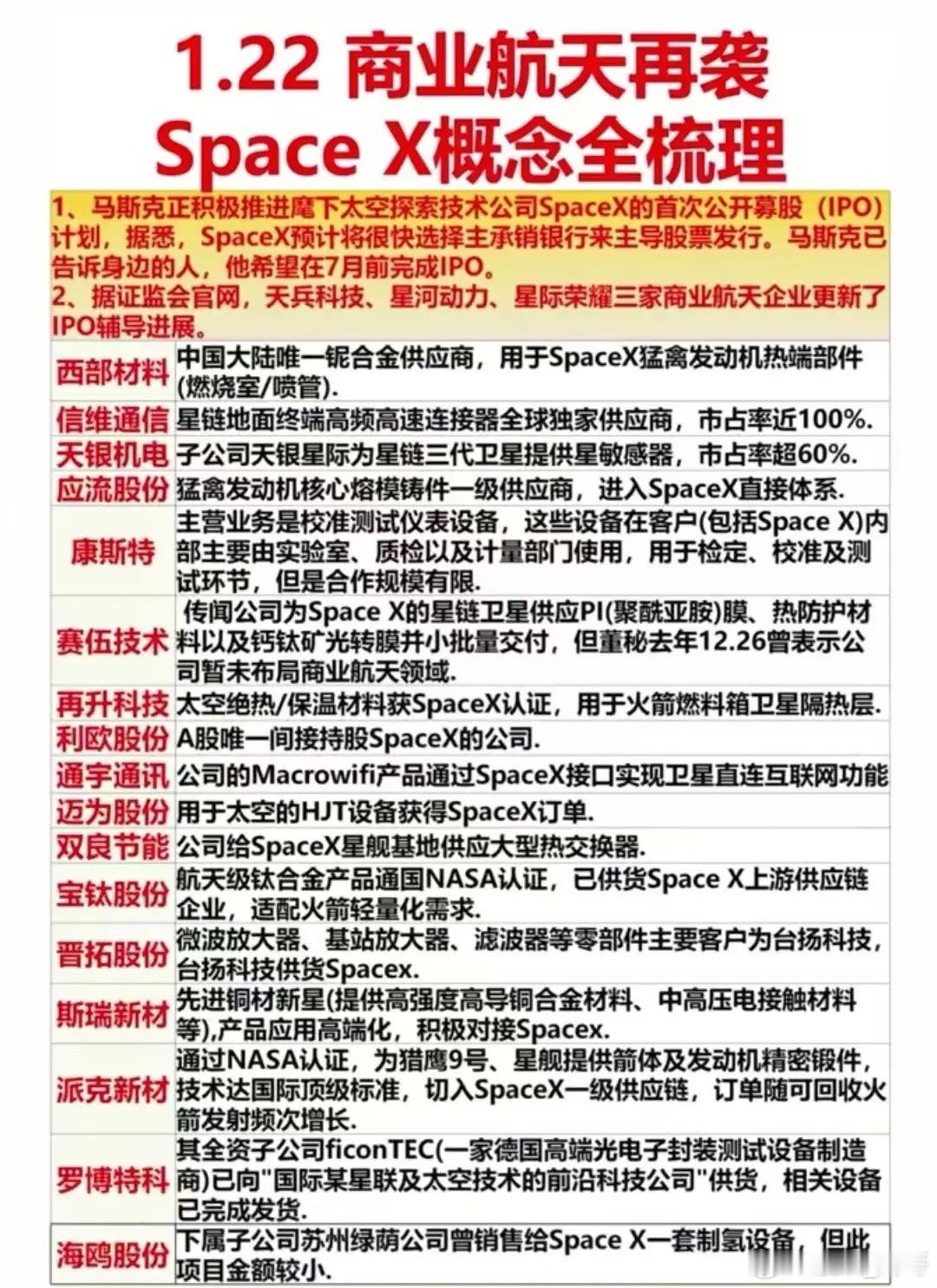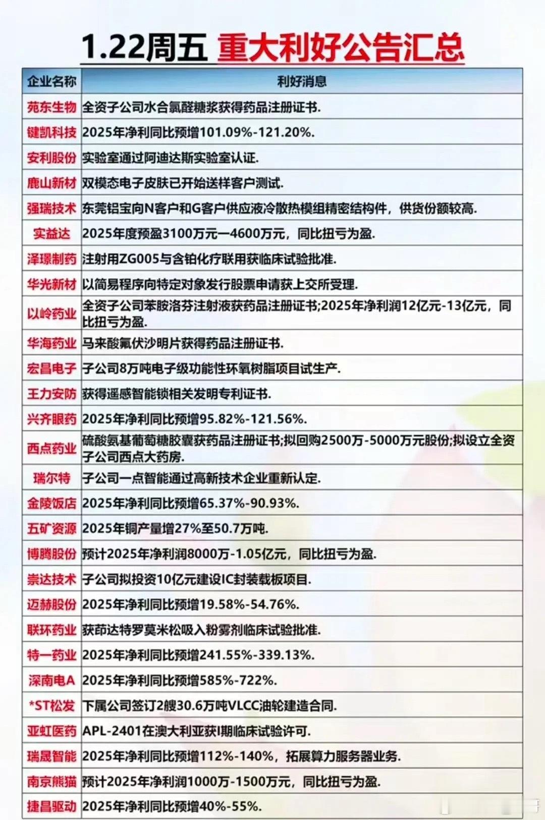 1月22日晚间利好重磅来袭:SpaceX剑指7月IPO、中国星网计划部署1.3万颗低轨卫星国产GPU龙头燧原科技科创板IPO获受理、宇树科技人形机器人年出货超5500台、阿里入股机器人公司+平头哥启动上市、九部门鼓励药店并购重组…🚀 SpaceX 加速推进 IPO,商业航天风口再临!从箭体材料到卫星核心部件,从星链配套到火箭热端组件,A股相关供应链龙头公司代表:西部材料、通宇通讯、信维通信……📊 1.22周四晚间新增年报预增TOP22出炉!深南电A以585%-722%的预增幅度领跑,特一药业、闰土股份等紧随其后,覆盖电力、流感、机器人、商业航天等热门赛道。📢 1.22周五重大利好公告汇总来袭!以岭药业、苑东生物等斩获药品注册证书,-宏昌电子珠海年产8万吨电子级功能性环氧树脂项目1月21日起试生产,期限至7月20日……以上利好公告仅为公开信息梳理,不构成任何投资建议。市场存在不确定性,需理性看待利好信息。