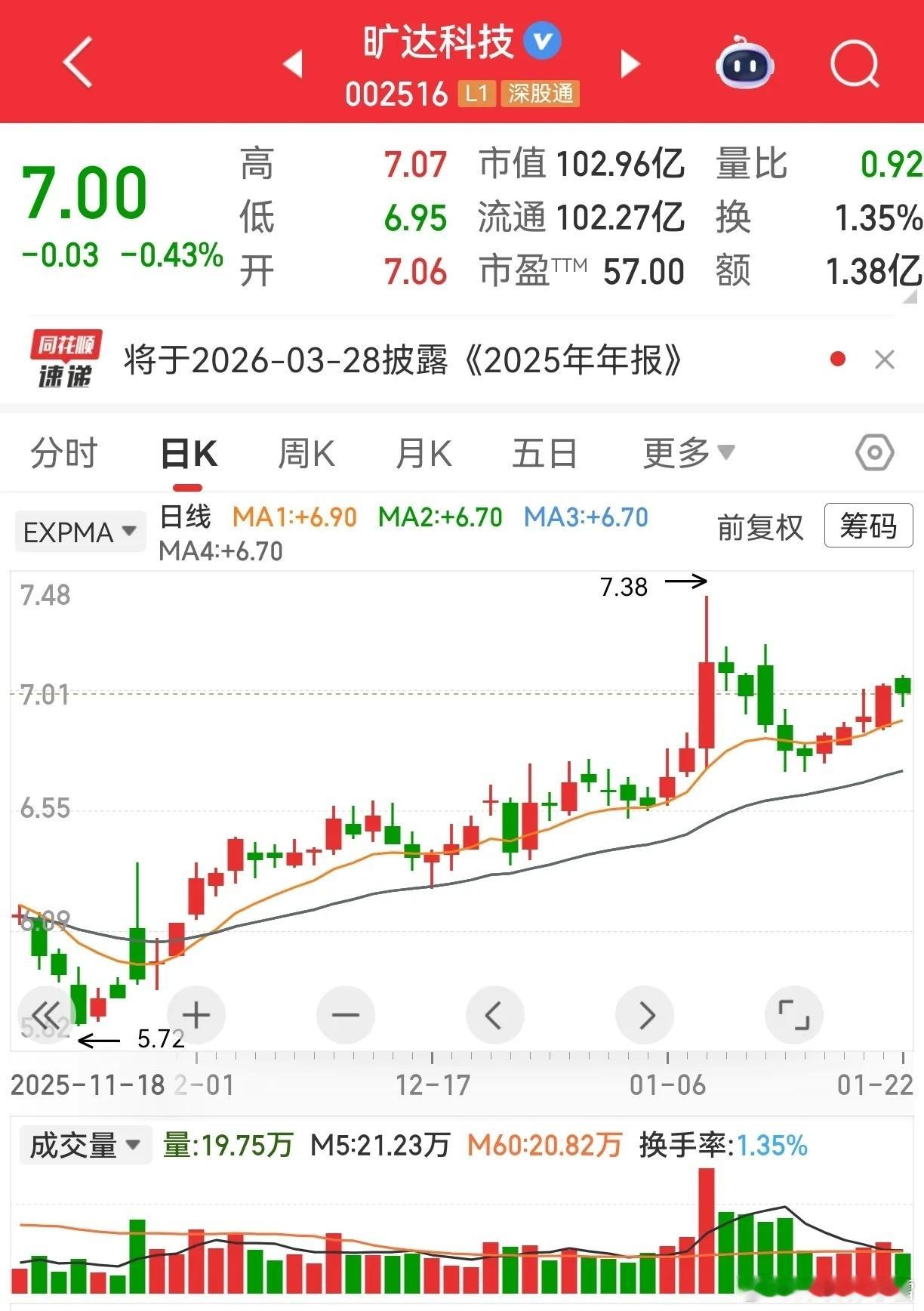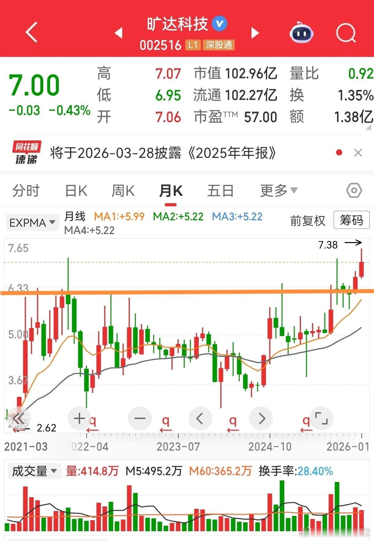 应粉丝朋友的旷达科技分析来啦!昨天忘更我的错,说到就得做到 浅浅唠唠个人看法,对错勿怪哈这票早前走出双阴立柱后一路下滑,25年11月大跌后开始慢涨,斜率缓波动小,不声不响的走势,懂的都懂有人在默默布局,不跌不涨就是在磨底蓄力月线看来到前期高点,这里消化浮筹再正常不过,目前稳稳绕着生命线上移,就差一波放量突破。这种票急不得,只能喝茶等风来,耐心蹲一个启动信号就好!