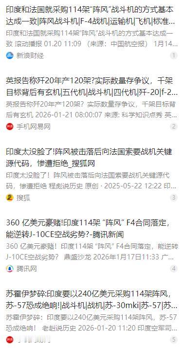 印度不信邪,再买114架阵风战机,却猛然发现:中国将有1000架歼-20。据法国国防航空门户网站Avionslegendaires最新报道,印度和法国正在敲定一份,关于“阵风”战机的“超级合同”,印度再砸360亿美元,增购至少114架“阵风”战机。其中包括大量“阵风”F4战机,以及至少24架最新号称“超级阵风”的F5标准“阵风”战斗机,而且这些“阵风”F4战机会在印度本土生产。 麻烦看官老爷们右上角点击一下“关注”,既方便您进行讨论和分享,又能给您带来更多优质的内容,感谢您的支持! 2026 年初,印度和法国的军贸合作迎来新进展,双方正敲定一份价值约 360 亿美元的阵风战机采购超级合同,计划增购的 114 架战机,成为阵风战机外销史上的大单,这一消息也得到了多方权威媒体的印证。 这份合同里的战机配置有明确规划,并非全部为现成机型,其中以 F4 标准阵风战机为主,还包含将 F4 升级为 F5 标准的选择权,24 架 F5 标准战机后续将由法国本土生产,并非直接采购。 此次采购的阵风 F4 战机,也并非全部在印度本土生产,而是由法国先交付 18 架整机,剩余 96 架在印度那格浦尔的合资工厂组装,印方还计划逐步将本土化比例提升至 60%,和引进空客 C-295 运输机的模式相近。 印度铁了心砸钱买阵风,核心原因是自家空军的机队现状太窘迫。大批米格 - 21 等老旧战机接连退役,具备现代作战能力的中型战机缺口超 200 架,现役 36 架阵风难以支撑,印度想靠新订单实现空中战力的翻盘。 不仅如此,印度国产的光辉战机也掉了链子,交付进度缓慢且国产化率仅 62%,关键技术还卡脖子,短时间内根本无法填补战机缺口,这也让印度更加依赖外购战机来维持空军的作战能力。 和印度大手笔外购战机形成鲜明对比的,是中国歼 - 20 隐身战机的发展速度。随着涡扇 - 10C 发动机成熟量产,涡扇 - 15 版本也实现批量生产,歼 - 20 的产能瓶颈被彻底打破,脉动生产线让量产效率大幅提升。 英国皇家联合军种研究所等智库给出数据,当前歼 - 20 的年产量已达到 120 架,现役数量也突破 300 架,按照这个生产节奏,到 2030 年,中国空军可部署的歼 - 20 规模将朝着千架级迈进,成为全球规模最大的重型五代机机群。 印度也想借着阵风本土组装的机会,提升本国的航空工业能力,把这次军购当成发展本土军工的契机,还要求法国配合整合印度国产武器和航电系统,试图通过技术合作实现军工的自主突破。 但理想很丰满,现实却很骨感。印度在光辉战机等自研项目中,早已暴露了关键技术自主突破难的短板,本土军工企业的制造和研发能力都跟不上,想靠组装阵风实现技术逆袭,难度可想而知。 更关键的是,法国根本不会把核心技术交给印度。此前印度多次索要阵风雷达、任务计算机等核心系统的源代码,都被达索公司坚决拒绝,法方仅同意做武器的物理整合,软件层面的核心技术始终牢牢掌握在自己手里。 即便此次采购合同中,印度提出了技术转让的硬性要求,但从双方过往的合作来看,法国大概率只会做表面让步,不会真正放开核心技术,印度想通过组装阵风掌握先进战机研发制造技术,终究只是一场空。 印度豪掷 360 亿美元买阵风,这笔开销对其军费来说也是不小的压力。印度 2025-2026 财年国防预算仅 783 亿美元,大部分还用于工资和养老金,装备采购经费本就紧张,巨额的采购成本再加上后续的维护费用,势必会挤压其他军工项目的投入。 这种靠单一战机采购提升战力的思路,本质上还是冷战式的军备竞赛思维,忽略了现代空战的体系化作战特点。中国的歼 - 20 早已融入多兵种体系作战,和预警机、无人机等装备形成协同作战能力,这是单靠几架先进战机无法比拟的。 印度想靠外购阵风来弥补和周边国家的空中战力差距,显然找错了方向。现代空战的胜负,从来不是单一装备的比拼,而是整个作战体系的较量,印度在军工自主化和作战体系建设上的短板,根本无法靠一份战机采购合同来弥补。 更何况,阵风战机即便完成交付,首批法国整机要到 2030 年才能到位,印度本土组装的机型交付时间更晚,而届时中国的歼 - 20 不仅规模突破千架,技术也可能迎来新的升级,印方想要靠阵风实现的战力翻盘,从一开始就失去了时间优势。