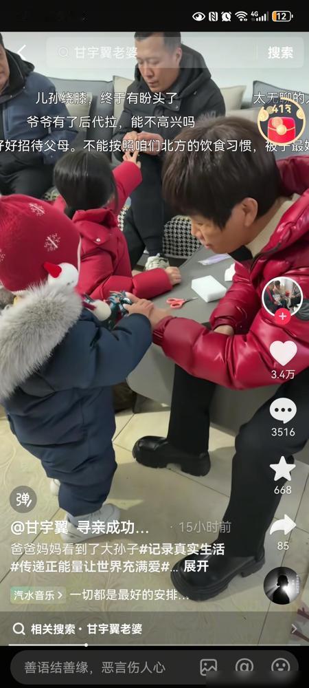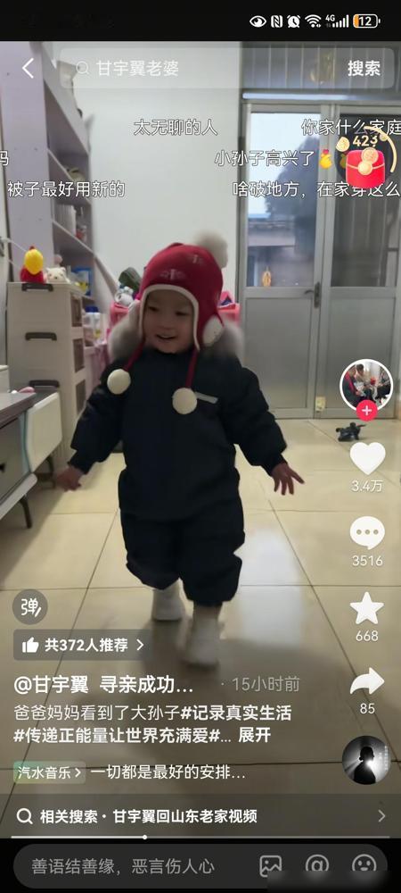 你们发现了没,刚回家的甘宇翼失宠了。甘宇翼从城市被拐到农村,从城市娃变成了农村娃。 这哥们儿寻亲成功后,最近特意把爸妈从老家接到了山东,想带老两口看看自己现在生活的地方,结果他在直播里调侃说,自己现在在家里简直成了“透明人”。 以前总有人替他唏嘘,说要不是那场意外,他本该在城市里顺顺当当读完大学,人生轨迹肯定大不相同。这种命运的断层确实挺让人遗憾的,毕竟那可是整整33年的错位。 但我看他直播时那个无奈的小表情,倒不像是真的委屈。你想啊,他带回家的不仅是自己,还有三个活蹦乱跳的孙子孙女,这一下就把老两口的心全勾走了。 现在甘爸爸甘妈妈的眼睛里全在盯着孩子,甘宇翼说自己连叫好几声爸妈都没人答应。这种“家庭地位直线下降”的戏码,其实才是普通家庭最真实的烟火气。 我倒觉得这种“失宠”反而是最大的幸福。对一个离家三十多年的人来说,如果父母对他总是客客气气、相敬如宾,那才叫真的还没回家。 现在这种由于隔代亲导致的“被忽视”,说明老两口已经完全没把他当外人,是真的把这儿当成自己家了。 而且这种补偿心态挺奇妙的。老两口错过了儿子成长的那些年,现在全在孙辈身上补回来了,这也算是命运给这家人的一点温柔补偿吧。 虽然错过了三十年的大学梦,但现在一家子整整齐齐在山东团聚,这种热气腾腾的结局比什么都强。