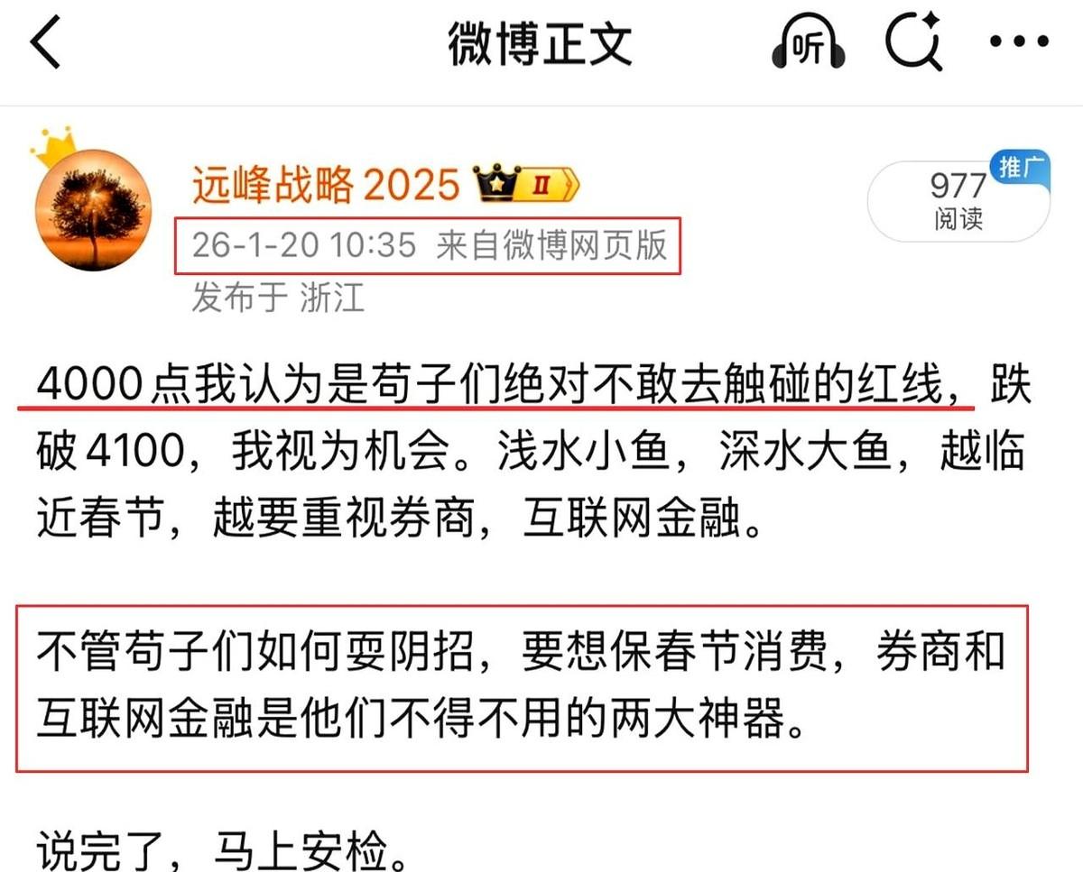 4100破了。 好多人估计已经吓得把手机都关了,眼不见为净。 我倒好,刚过安检,在候机厅里打开电脑,看得津津有味。 这叫事儿吗? 不就是一帮人拿刀互相吓唬嘛,谁先眨眼谁就输了。 记住一个数就行:4000。 这是底裤,不能再低了。 再低,就不是经济问题了,是脸面问题。 有些人,比我们这些小虾米更怕失控。 所以啊,满地哀嚎的时候,才是看清一个人的时候。 看的是胆量,是见识,更是人性。 别人恐惧到割肉离场,你呢?是跟着跑,还是悄悄把准备好的网兜打开? 都说浪大的时候鱼才最肥。 这话没错。 但水性不好的人,一个浪头过来也就没了。 能不能捞着,捞着多少,全是自己的本事和造化。 好了,广播催着登机了。 剩下的,各位自己琢磨吧。
