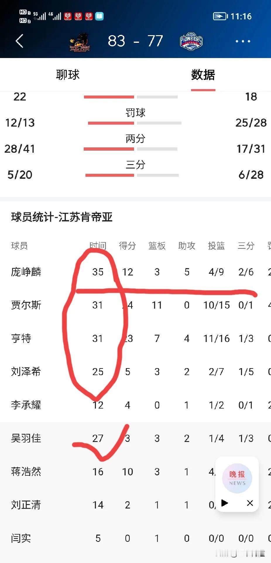 CBA江苏肯帝亚83:77胜天津: 庞峥麟:出战35分钟,投篮9中4,三分球6中