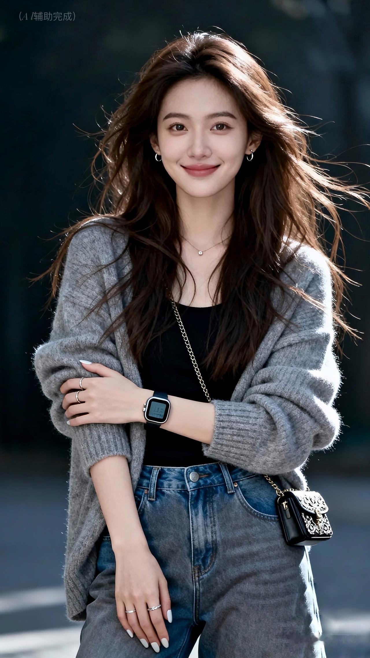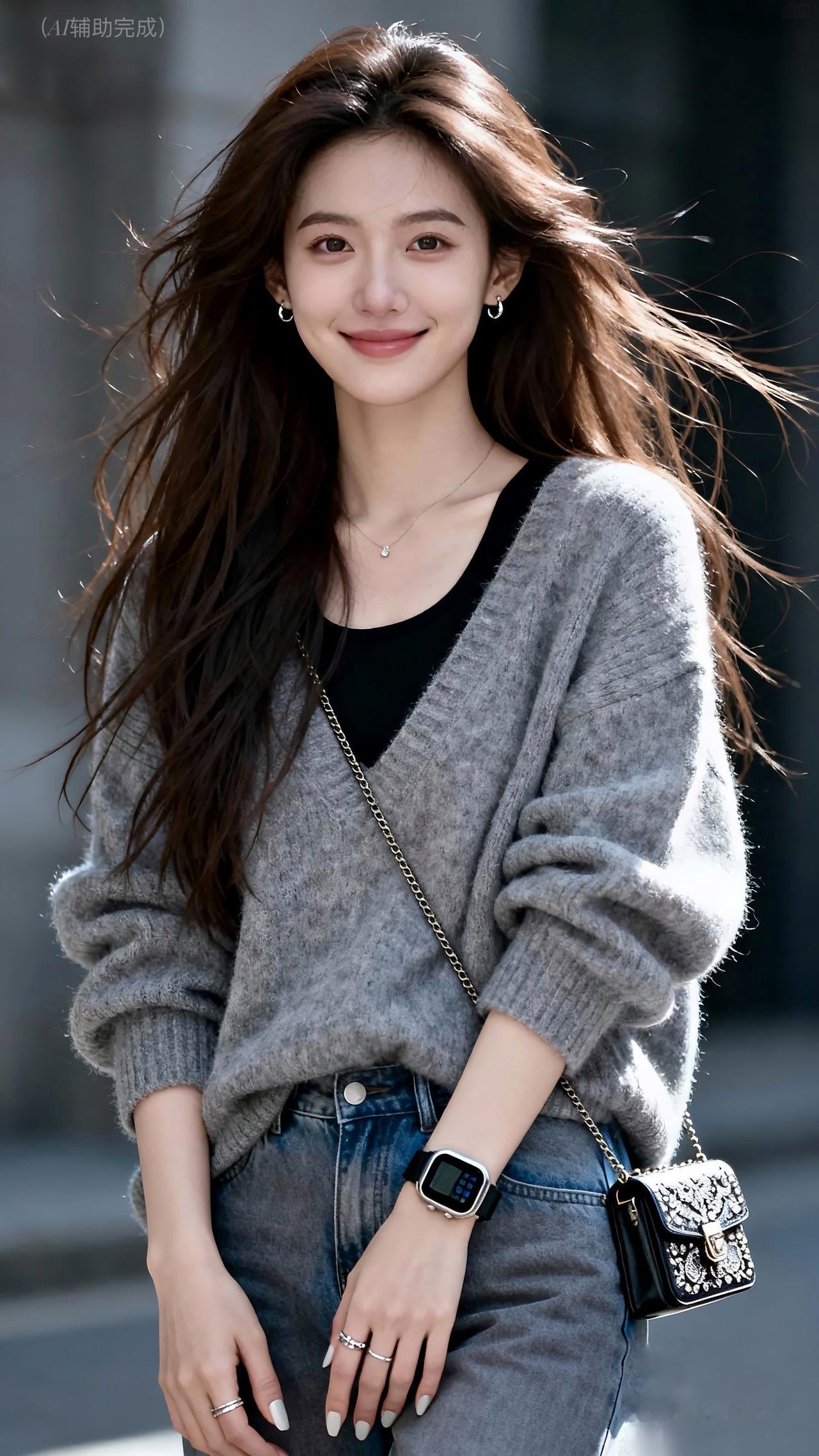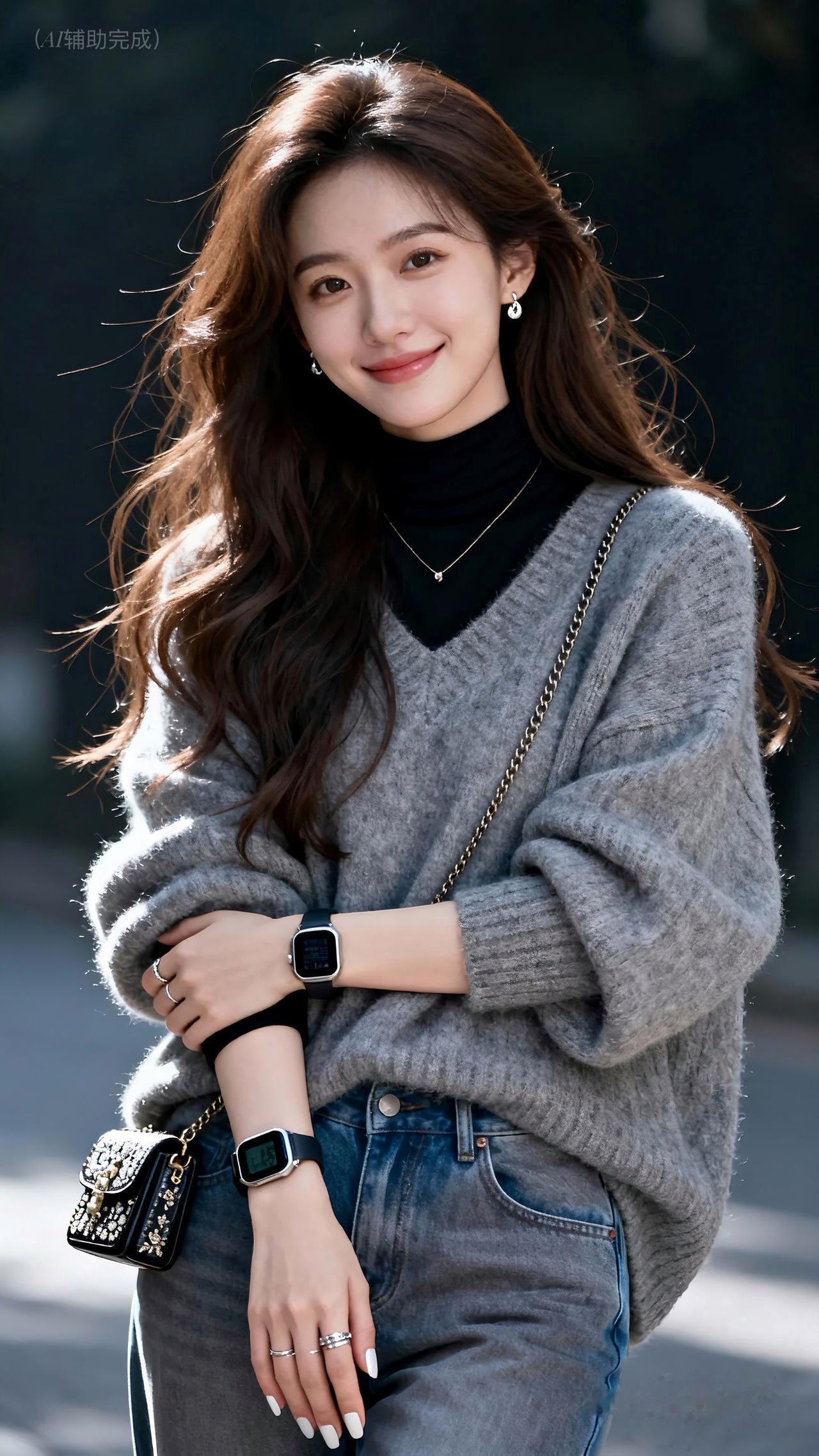 棕发乌发随风扬,灰毛衣裹黑内搭搭牛仔裤,智能手表小包添精致。眉眼含笑目光柔,灰调虚化衬从容。温婉优雅漫帧间,这帧都市丽人,一眼心动!