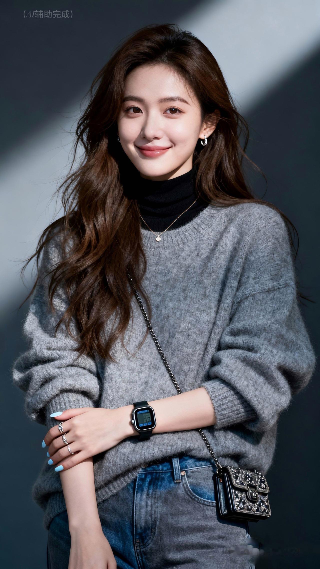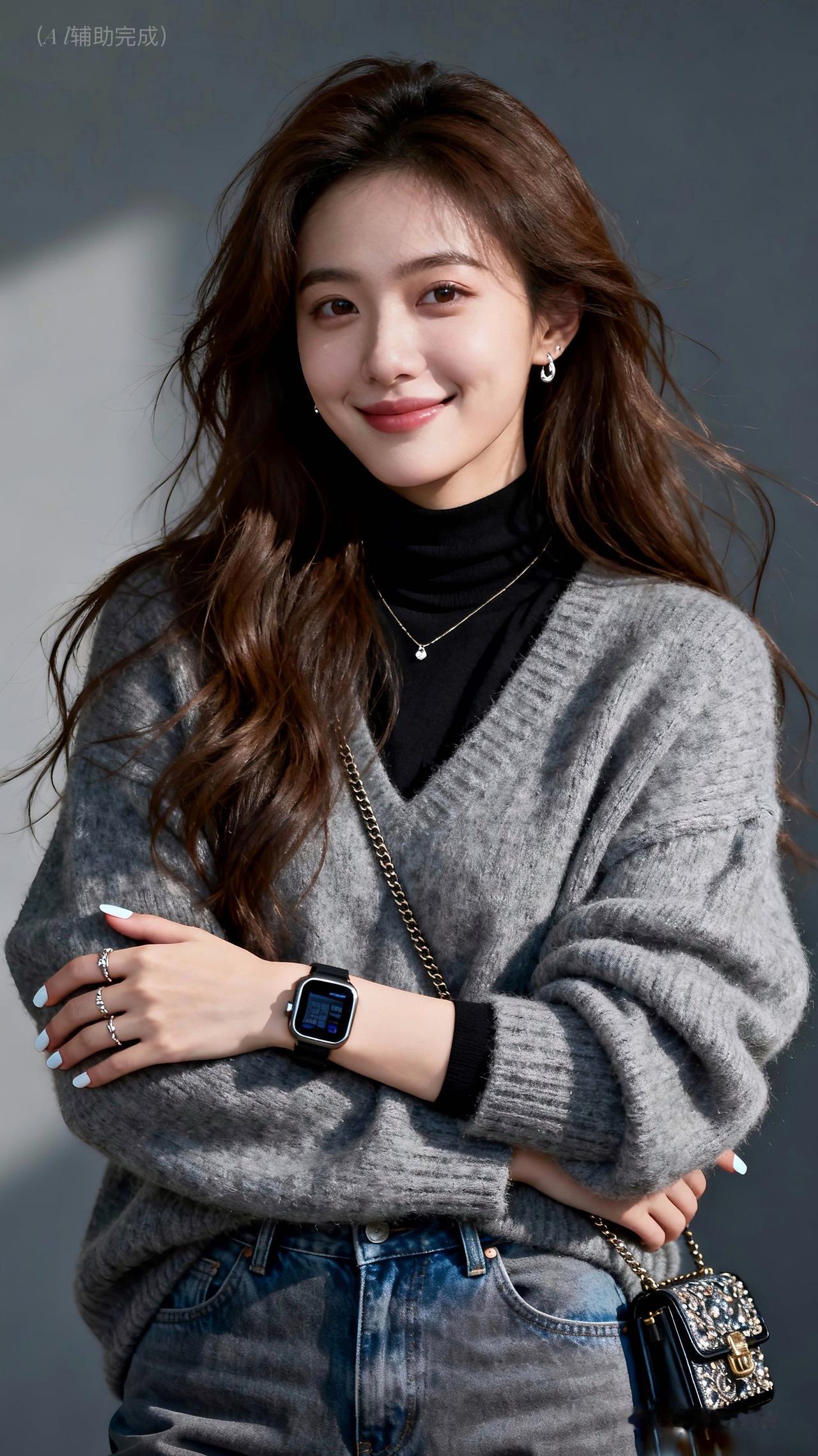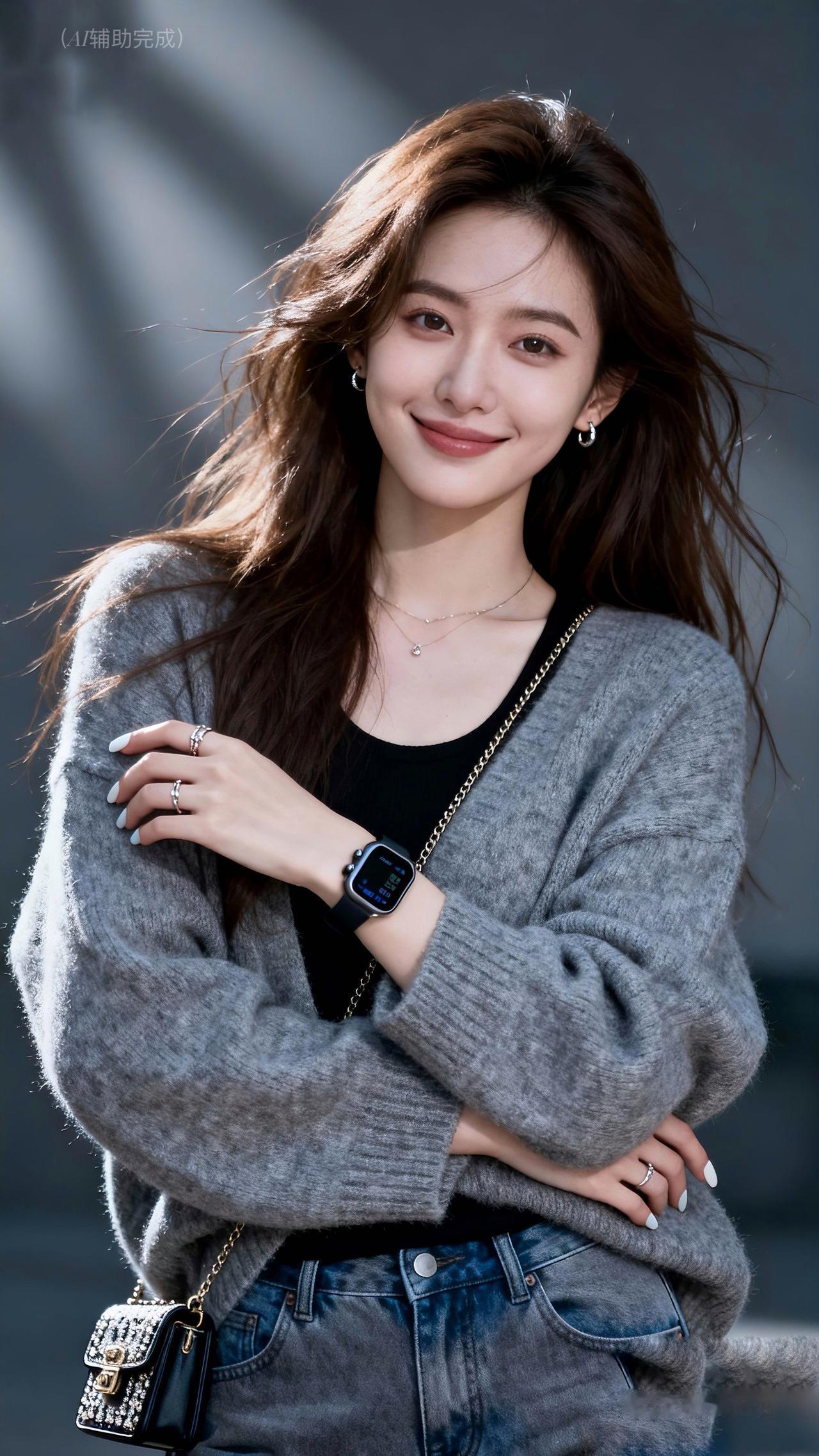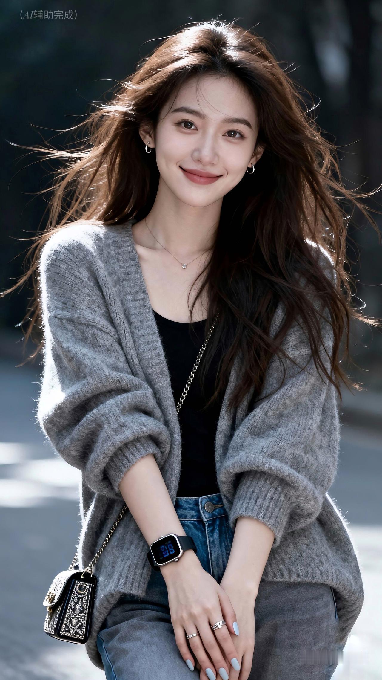 棕发乌发随风扬,灰毛衣裹黑内搭搭牛仔裤,智能手表小包添精致。眉眼含笑目光柔,灰调虚化衬从容。温婉优雅漫帧间,这帧都市丽人,一眼心动!
