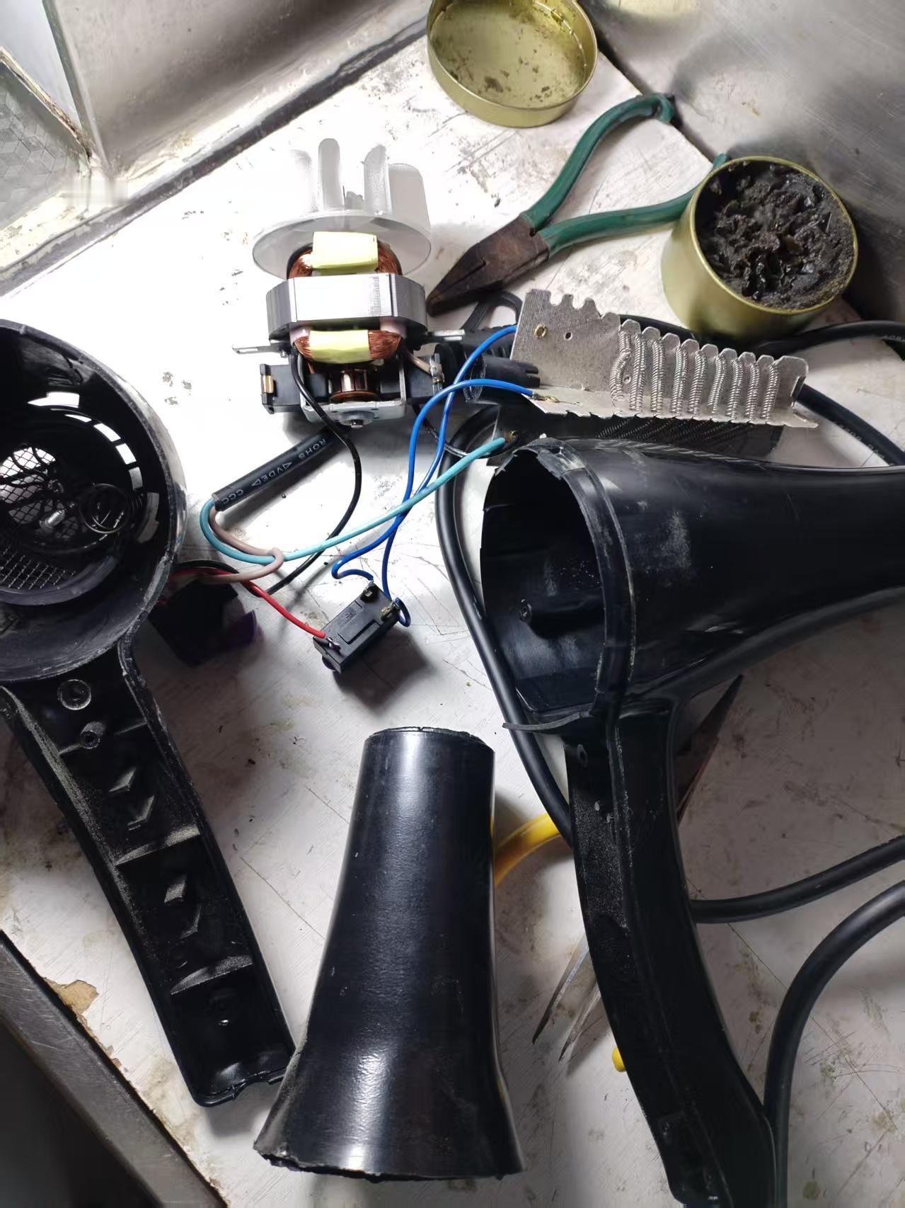 大约在半个月前,球馆的一个电吹风坏了,馆长让我帮忙修修。 大家知道,凡是在球馆里打球的人,经常会更换手上使用久了老化的胶皮。因此,为了快速风干胶水,使用电吹风是最好的选择。 那些日子,正赶上我手中的活计太多,忙的抽不开手,于是把修电吹风的事放置下来。为了不耽误球友们使用电吹风,我把家里闲置的一个新电吹风拿来,替代这个待修理的电吹风,也算为大家尽一点奉献。 最近,手中的活计忙的差不多了,有了时间,静下心来修一下这个电吹风。 我的理念是,像类似这些家里常用的小家电,除了中心元件坏了无法修理外,其余的小毛病,基本上都可以修好,重新使用的。 只是在检测故障中,有些意想不到的故障点,如果没有工作经验,真是又费工夫又费力。 经过我几次的反复检测,反复试验,终于找到了故障点,让这个电吹风又重新转了起来。 在球馆里,能为大家尽微薄之力,从心里高兴,希望球馆越办越好。