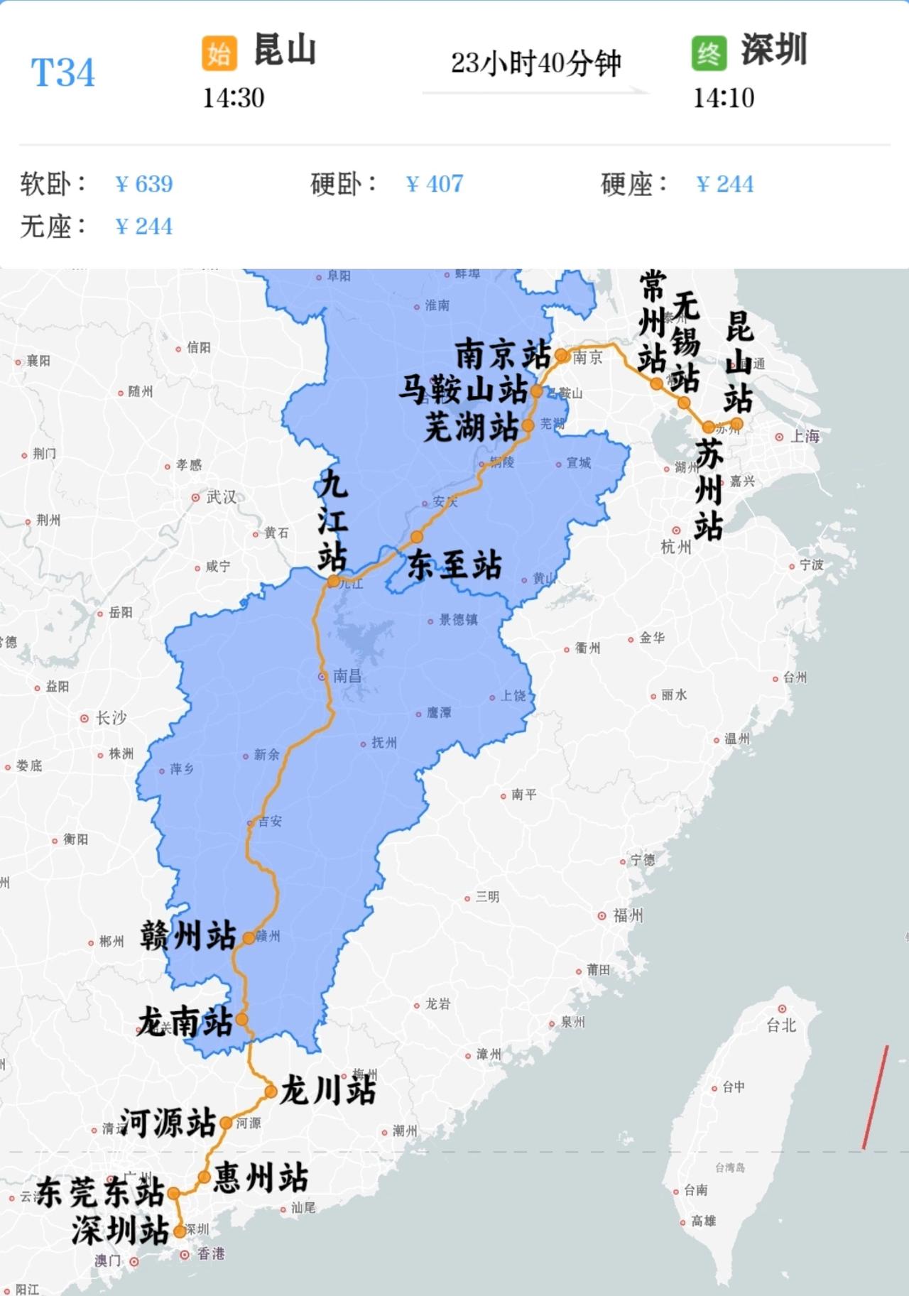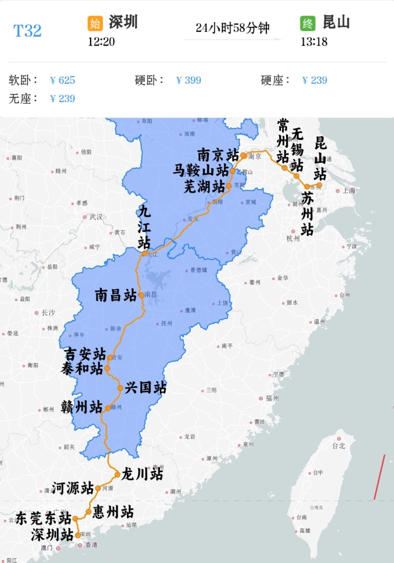 2026年1月25日起深圳到苏州K34/K35次快速列车升级为特快列车,车次改为T32/T33次,并延伸至终到昆山站,增加停靠兴国站、吉安站、无锡站,最高时速由原来的120㎞/h提升到最高时速140㎞/h,南京站换向不变。 2026年1月26日起苏州到深圳K36/K33次快速列车升级为特快列车,车次改为T34/T31次,并延伸至昆山站始发,取消停靠镇江站,增加停靠无锡站,最高时速由原来的120㎞/h提升到最高时速140㎞/h,南京站换向不变。