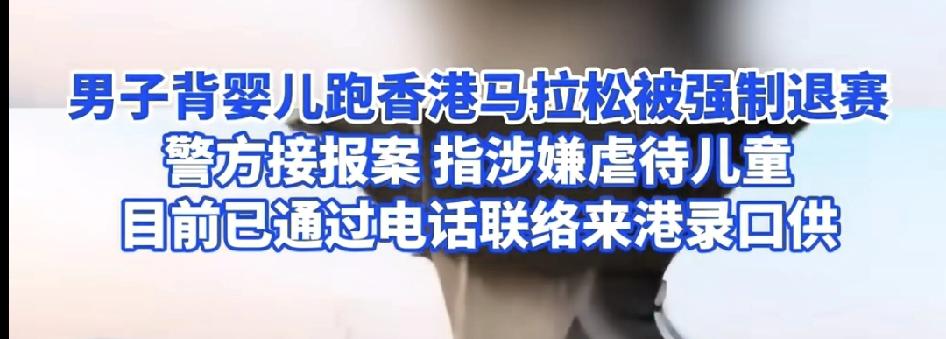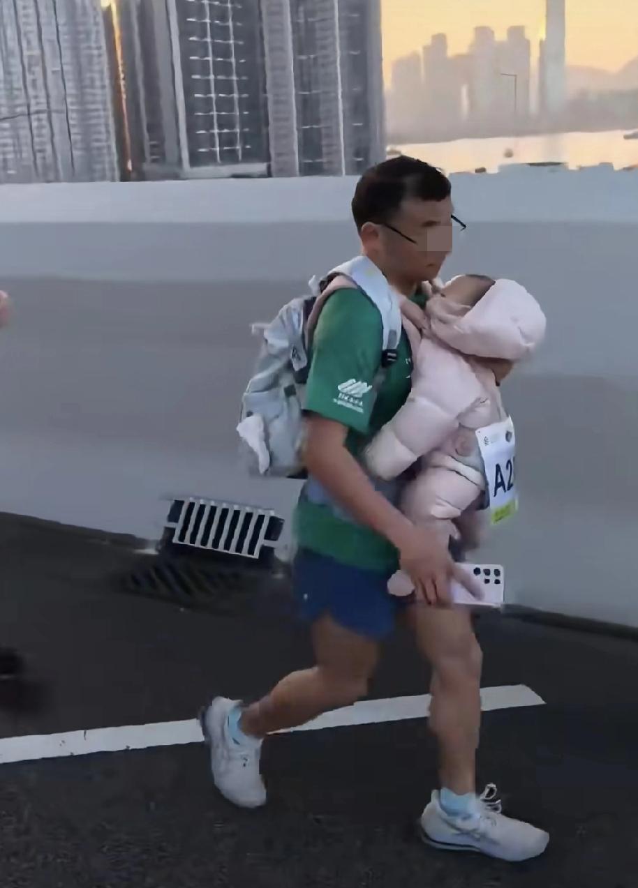 带婴跑马的奶爸回家得被家人骂惨,风头没出不说,还被立案召回录口供。 几天前此男子带着小婴儿跑香港渣打马拉松,全程约42.2公里,他起步后2小时20分钟左右跑了15公里,后面被截停。 就因为在他胸前挂着一个裹着粉色防风被的宝宝,看着也就几个月大。 男人跑得不快,但毕竟不是在婴儿车里,孩子也要跟着他的步伐上下晃动。 一岁以内的宝宝囟门都没长合,这种震颤颈椎顶不住,弄不好还会脑震荡,他这个奶爸当得太不合格了! 跑步当天就有人录下他带娃跑的视频,阿sir也立马找人,但人家被拦截后就当即打道回南宁了。 跑马有明确规定,禁止携带婴儿、未成年人进入赛道,想玩儿就得遵守规则啊!