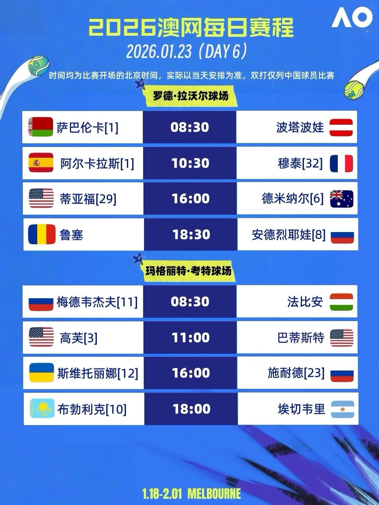 澳网2026澳网赛程 1月23日,澳网正赛第6日,男女单打进入第三轮,双打进入第二轮。🇧🇾萨巴伦卡、🇪🇸阿尔卡拉斯、🇦🇺德米纳尔、🇷🇺安德烈耶娃亮相中心球场;🇺🇸高芙、🇷🇺梅总再玛格丽特·考特球场登场;🇩🇪兹维列夫、🇮🇹保利尼在约翰·凯恩球场登场。🇨🇳中国球员只有王欣瑜进入单打第三轮,明日休息;徐一璠和杨钊暄将出战女双第二轮。📍6号球场 09:30🇨🇳徐一璠/杨钊暄VS🇨🇿西尼亚科娃/🇺🇸汤森德