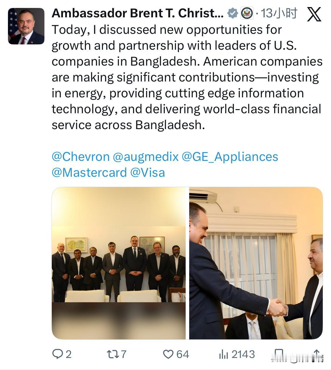 美国驻孟加拉国大使布伦特·克里斯滕森(Brent Christensen)于1月20日在孟加拉达卡会见了在孟加拉运营的美国公司的代表。此次会面是他抵达孟加拉国后不久进行的几次重要会晤之一,他于 1 月 12 日抵达达卡,并于 1 月 15 日递交了国书。