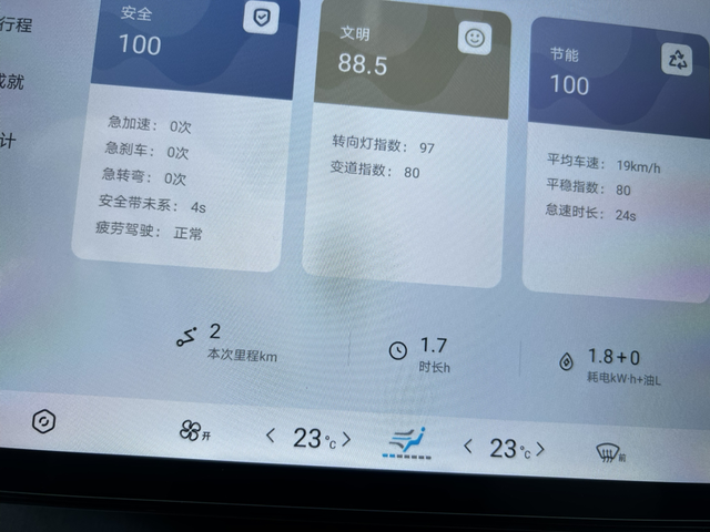 开空调能耗 112版本,开了30公里一小时(全程23度自动)然后到地方午休又开了差不多2小时空调,车机上看的数据算下来是1.8小时1.5度电左右家充0.43一公里,等于中午在车上开空调睡觉俩小时花费不到一块钱,还是相当不错的