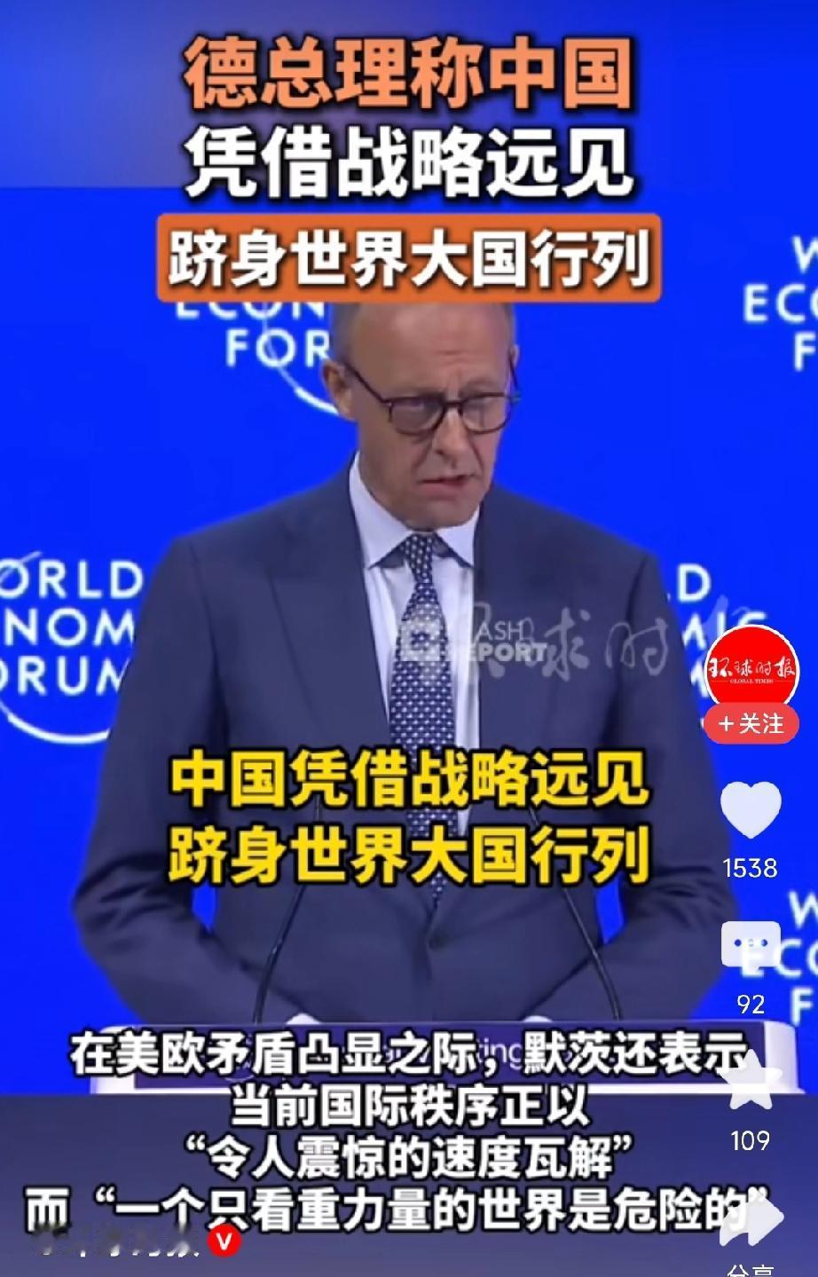 看看特朗普把德国逼成啥了…… 逼得一个通常站在对面立场上的德国总理,竟然在达沃斯上公开说中国好话。 之前卡尼买了4.9万辆中国车来表达对美国不满,现在德国也在表达愤懑。 特朗普还要霸权多久,这正在考验全球国家。