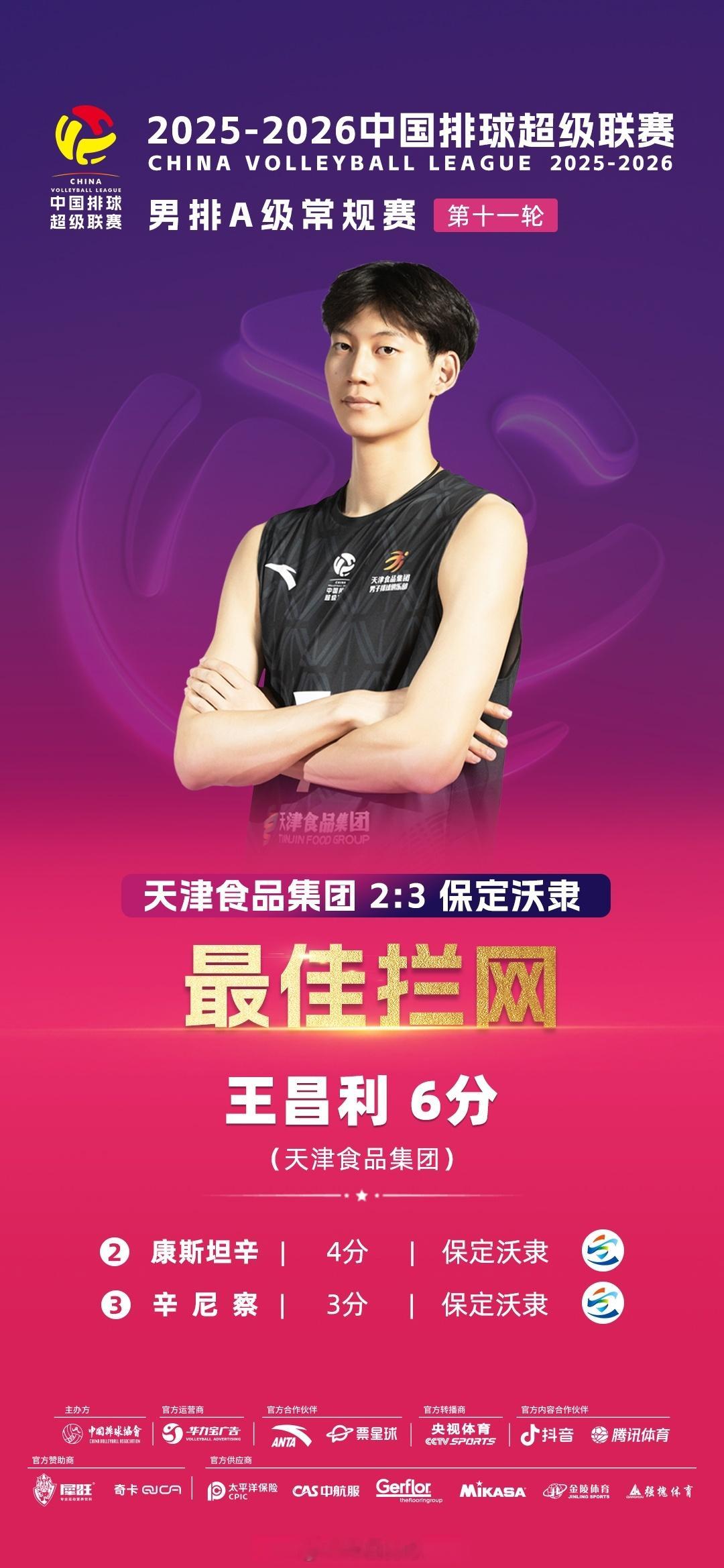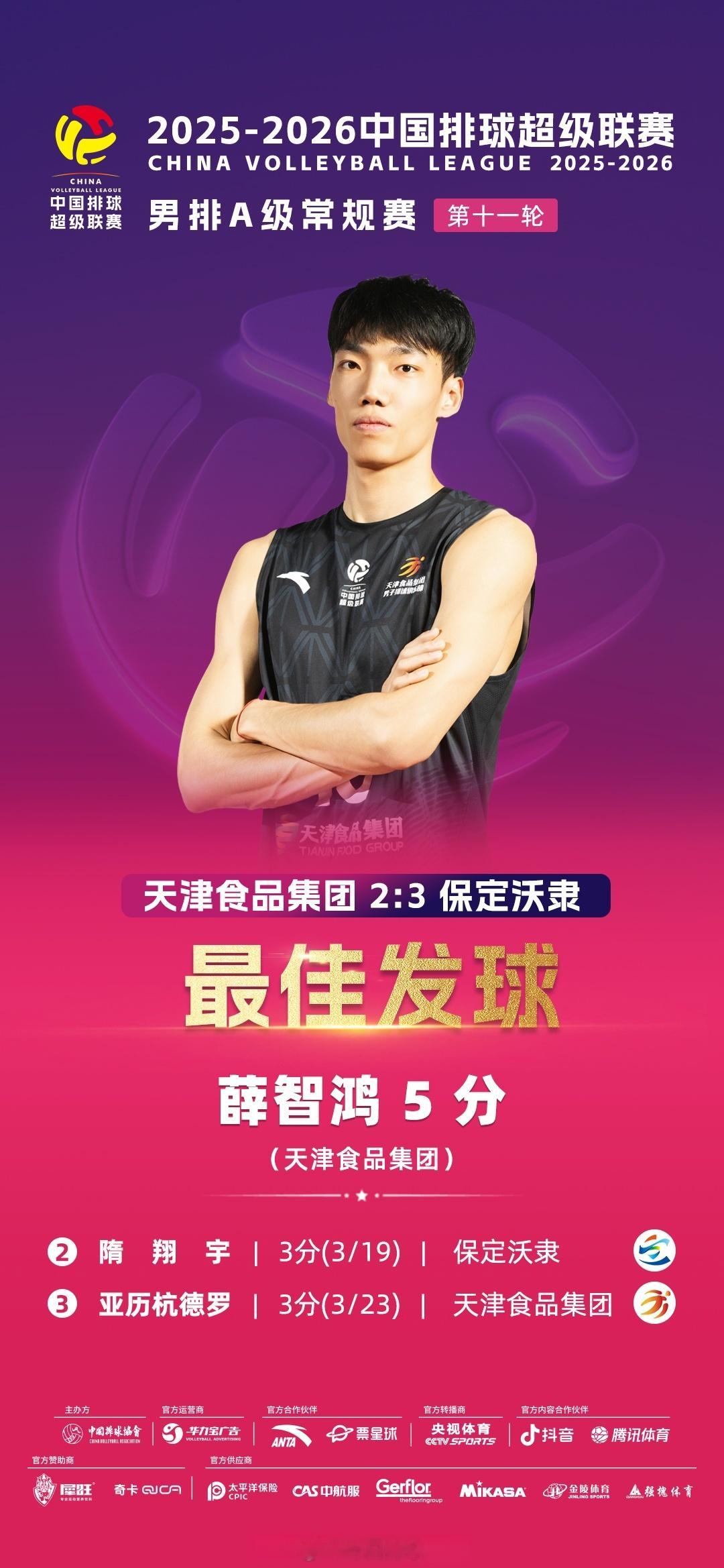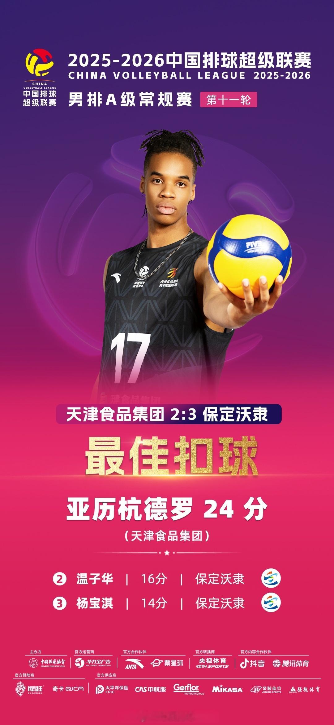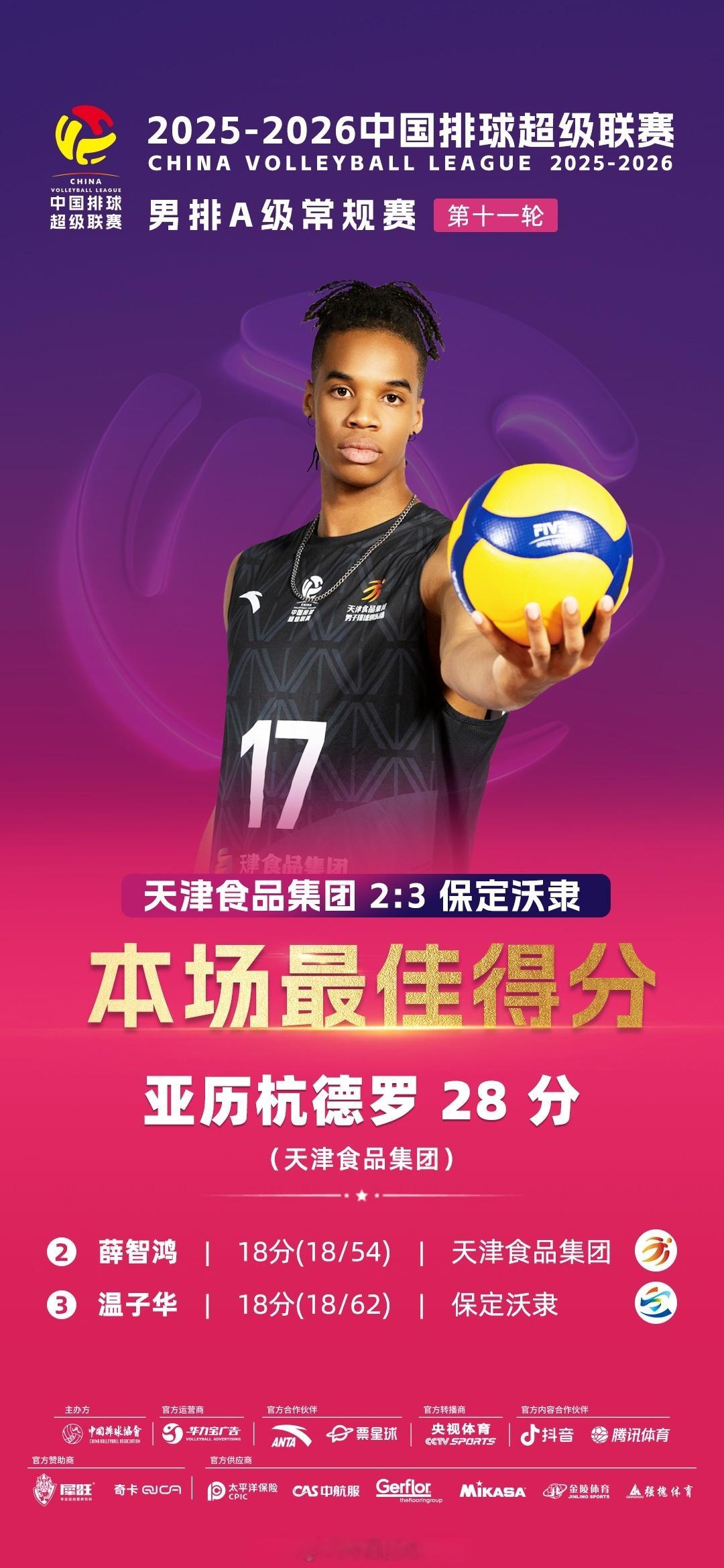 2025-2026中国男排超级联赛 A级常规赛第11轮焦点战 天津食品集团2-3保定沃隶 之“本场最佳”——最佳得分:亚历杭德罗(天津食品集团)28分 最佳扣球:亚历杭德罗(天津食品集团)24分 最佳拦网:王昌利(天津食品集团)6分 最佳发球:薛智鸿(天津食品集团)5分跃见你我