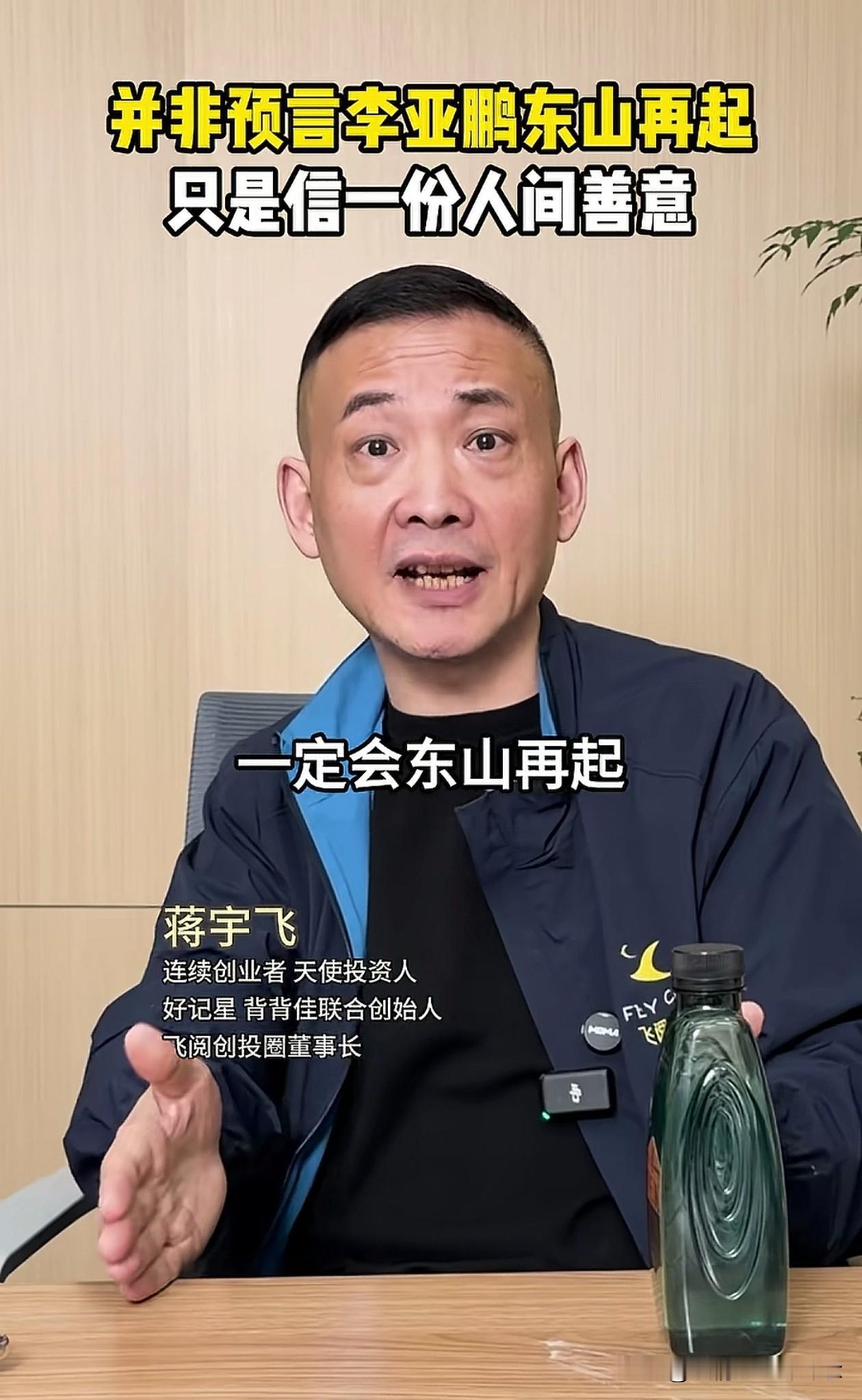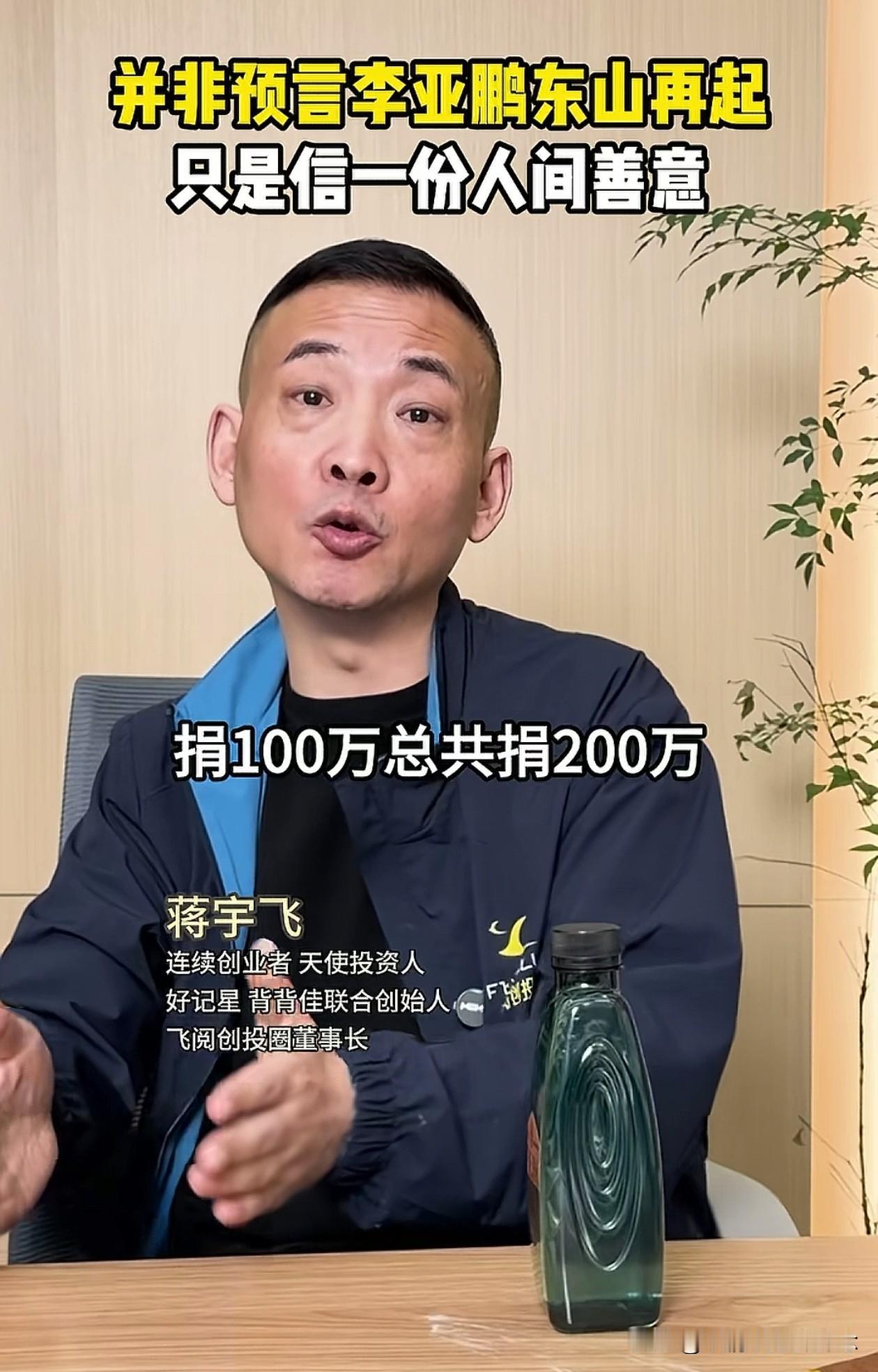 曾在去年5月预测李亚鹏会在一年左右走出低谷的蒋宇飞,再发视频,向嫣然儿童医院捐款200万。 蒋宇飞曾在去年5月录视频预测李亚鹏会在2026走出低谷,好多网友说他是预言家。 最近他再发视频谈起这个事情,他说并不是预言李亚鹏会东山再起,只是信一份人间善意。 他说,他接触的李亚鹏,和公众理解的李亚鹏有很大区别,他没有明星架子,就是一个普通的中年男人,一个父亲。他卖茶叶时一天播八九个小时,把挣的钱都拿去给员工发工资,去还债。 蒋宇飞说自己被李亚鹏感动了,自己也想尽绵薄之力,以个人和公司的名义各捐100万,一共200万。 原来真正的预言,从来不是预判一个人的高光时刻,而是看见他低谷里的咬牙坚持。 我们都相信,只要你一如既往的做好事,终将会被社会发现,被大众看见。李亚鹏唤起了人们心中的善,这种善意会传染,你只管向前,自有同路人披星戴月赶来与你并肩。
