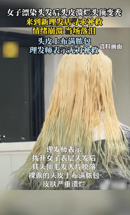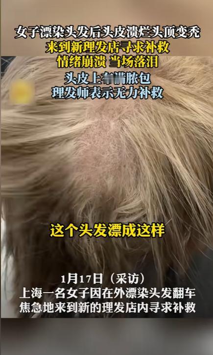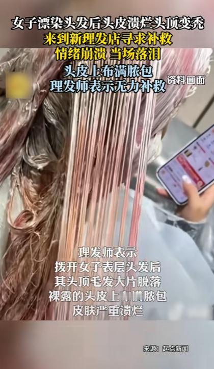 “太吓人了!”近日,上海,一女子去理发店染发,理发师掀开她的头发发现,她里面的头发大量脱落,裸露的头皮都是脓包,已经严重溃烂,据悉,女子是在别处漂头发“翻车”,导致头皮受损,说着就开始崩溃大哭。网友:这下后悔了吧! 孙女士(化名)平时很关注社交平台,看到不少博主把头发染成浅色、粉色、灰紫色,看起来时尚又个性,心里十分羡慕,她本身发质偏细,但并未出现明显脱发或头皮问题,于是决定也尝试一次“漂发”。 在一家理发店里,理发师简单询问后,便为她进行了漂色处理,整个过程持续了较长时间,头皮多次接触高浓度漂粉和双氧水,孙女士当时就感到刺痛和灼热,但被告知“漂发都会这样,忍一忍就好”。 回家后情况非但没有缓解,反而出现明显疼痛,第二天洗头时,她发现手上掉了大量头发,头皮一碰就疼,甚至有渗液的情况,几天后,脱发愈发严重,头发一撮一撮地掉,局部已经明显稀疏,孙女士这才意识到问题不对。 无奈之下孙女士又找了一家理发店,想要看看有没有什么可以补救的,可到了店里面之后理发师将她的头发一掀开就看到了里面一大坨的,脱发甚至有的地方已经溃烂结痂,明显属于严重头皮损伤,理发师建议她立刻停止一切染烫行为,尽快就医处理,否则可能留下长期后遗症。 听到这些话,孙女士情绪彻底崩溃,她表示,自己只是想染个头发变好看,没想到会变成现在这样,不仅形象受损,日常生活也受到影响,睡觉翻身都会疼。 事后了解到,她是在前一家理发店漂发“翻车”,化学药剂刺激过度,直接损伤了毛囊和头皮屏障,才导致脱发和感染。 相关经历被发到网上后,引发大量网友讨论,有人心疼她的遭遇,认为部分理发店为了效果忽视风险,也有人提醒,漂发并非适合所有人,尤其是发质细软、头皮敏感的人,更应谨慎选择,还有网友分享类似经历,表示“颜色好看只是暂时的,头皮受伤可能是长期的”。 这起事件也再次提醒公众,美发并非小事,涉及化学制剂的操作存在明确风险,消费者在追求美观的同时,更应关注安全,理发店也应如实告知风险、规范操作,否则一次“翻车”,付出的代价远不只是头发本身。 信息来源 :南京广播电视台