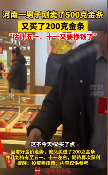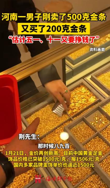 这就是命啊!河南郑州,一男子见近期金饰克价逼近1500元,觉得差不多了,果断卖掉500克金条,而这些金条是600多一克时购买的,这一买一卖就让他血赚了,有意思的是,买完后他又买了200克,准备过段时间再卖掉。网友:看来我卖早了 王先生(化名)从多年前开始,就养成了“存黄金”的习惯,在他看来,现金会随着通胀慢慢缩水,放在银行里利息跑不赢物价,而黄金虽然也有波动,但长期看更能保值,他并不热衷短线操作,也不追涨杀跌,而是逢低慢慢买入,把黄金当作一种“看得见、摸得着”的资产储备。 几年前,当金价处于相对低谷时,王先生选择分批购入很多金条,其购入成本大多维持在每克五六百多元,也没想着马上赚钱,只是觉得价格合适,就当存钱一样放着,这些金条被他妥善保管,几年下来几乎没怎么动过。 最近一段时间,金价持续走高,郑州多家金店的金饰克价已经逼近一千五百元,王先生开始认真关注行情变化,反复对比了回收价和市场走势后,觉得价格已经进入自己心中的“合理兑现区间”,他并没有幻想卖在最高点,而是选择在心理预期内果断出手。 最终,王先生一次性卖出了五百克金条,按照回收价格计算,这一卖一买之间,单克价差达到数百元,总体收益相当可观,王先生表示,真正拿到钱的那一刻,心里还是挺踏实的,感觉这些年坚持的判断没有白费。 更让网友觉得“有意思”的是,王先生并没有因此清仓离场,卖出之后,他很快又买入了200克黄金,作为新的长期储备,在他看来,黄金依然具备配置价值,只是需要控制节奏,低买高卖,留有余地,而不是一把梭哈。 王先生也坦言,自己并不是什么投资高手,只是遵循一个简单原则,不盲目跟风,不借钱投资,买得起、放得住、卖得掉,他觉得黄金更像一种“压舱石”,赚多赚少并不是最重要的,关键是在关键时候能稳住资产。 事情传到网上后,网友纷纷留言,有的羡慕他“眼光好、执行力强”,有的感叹“普通人最怕的不是错过机会,而是没耐心”,也有理性声音提醒,金价有涨有跌,这次赚到了不代表次次都行,投资仍需谨慎。 从低位买入,到高位兑现,再重新布局,王先生的操作谈不上惊险,却胜在克制和清醒,这或许也是普通人面对资产配置时,最难得的一种能力。 信息来源 :海峡都市报