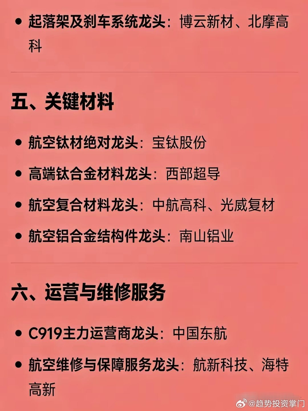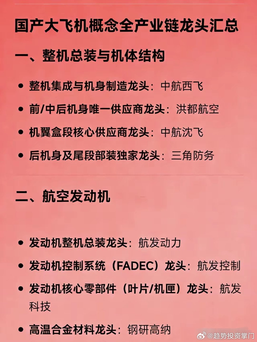 国产大飞机概念全产业链龙头速览1. 整机总装与机体结构:中航西飞(整机集成/机身)、洪都航空(全段机身)、中航沈飞(机翼盒段)、三角防务(后机身/尾段)2. 航空发动机:航发动力(整机总装)、航发控制(控制系统)、航发科技(核心零部件)、钢研高纳(高温合金)3. 机载系统:中航机载(系统整合)、中航光电(连接器)、江航装备(环控/氧气)、安达维尔(座椅/内饰)4. 关键零部件与锻件:中航重机(航空锻件)、爱乐达(精密加工)、博云新材+北摩高科(起落架/刹车)5. 关键材料:宝钛股份(航空钛材)、西部超导(高端钛合金)、中航高科+光威复材(复合材料)、南山铝业(航空铝合金)6. 运营与维修:中国东航(C919主力运营)、航新科技+海特高新(维修保障)