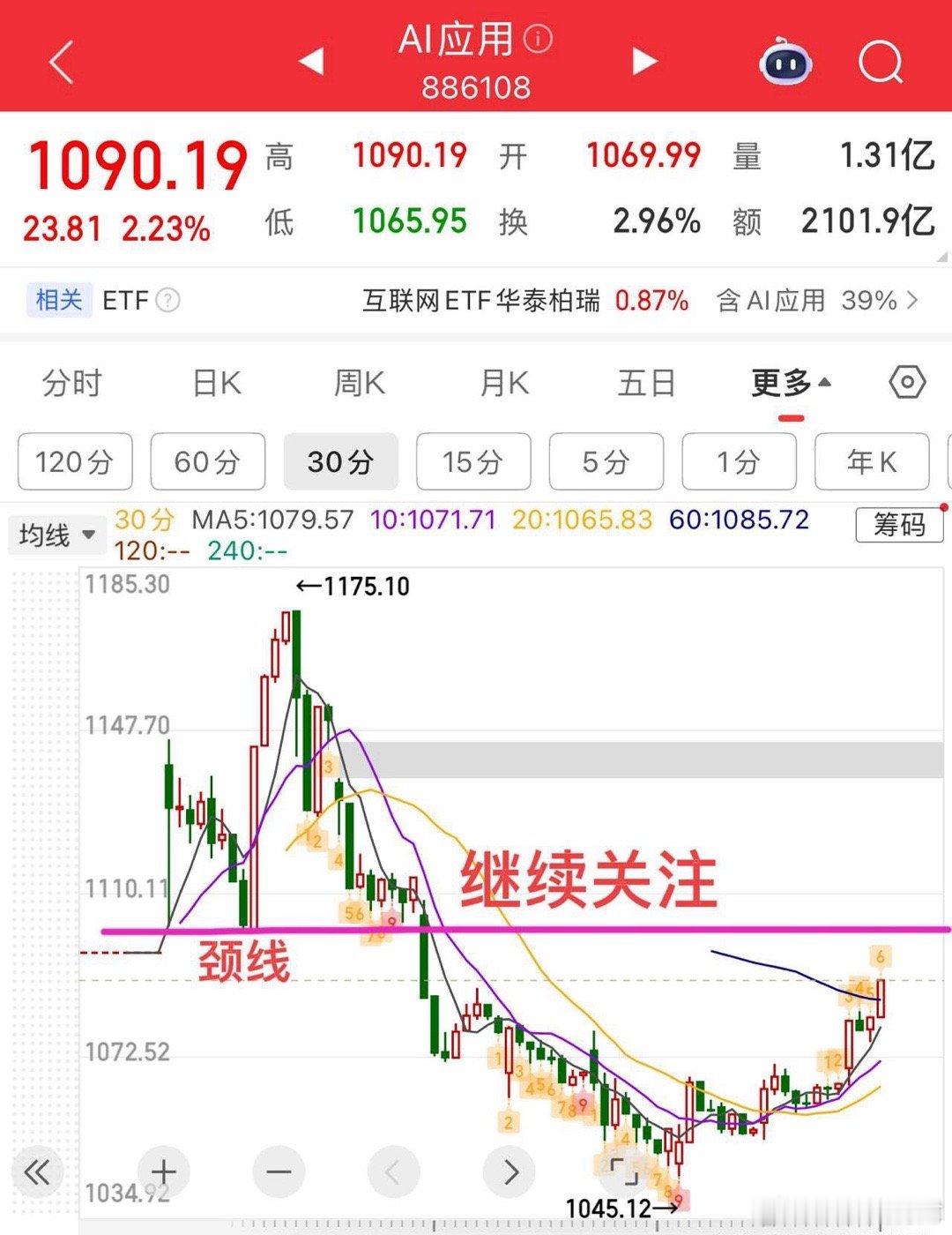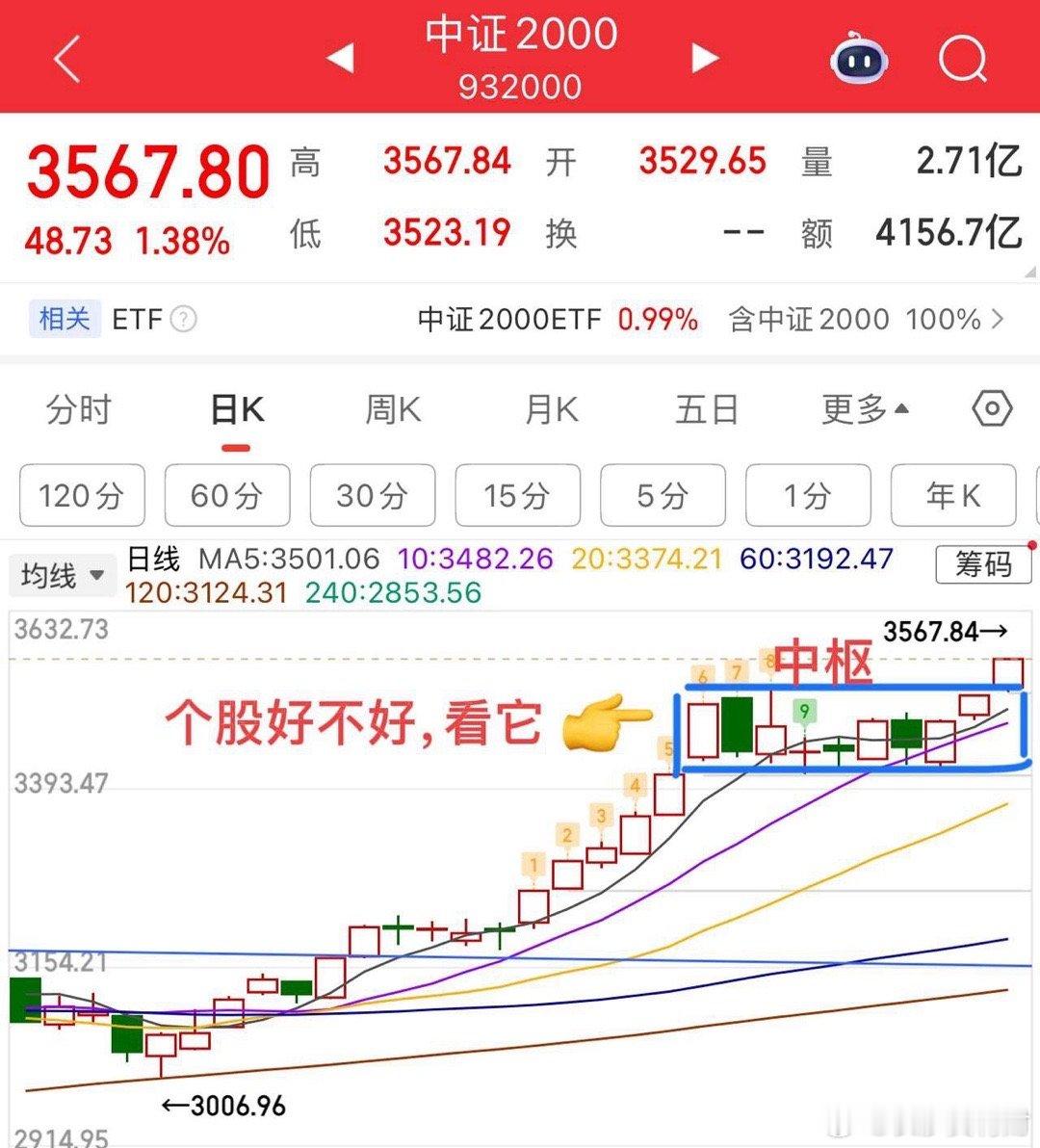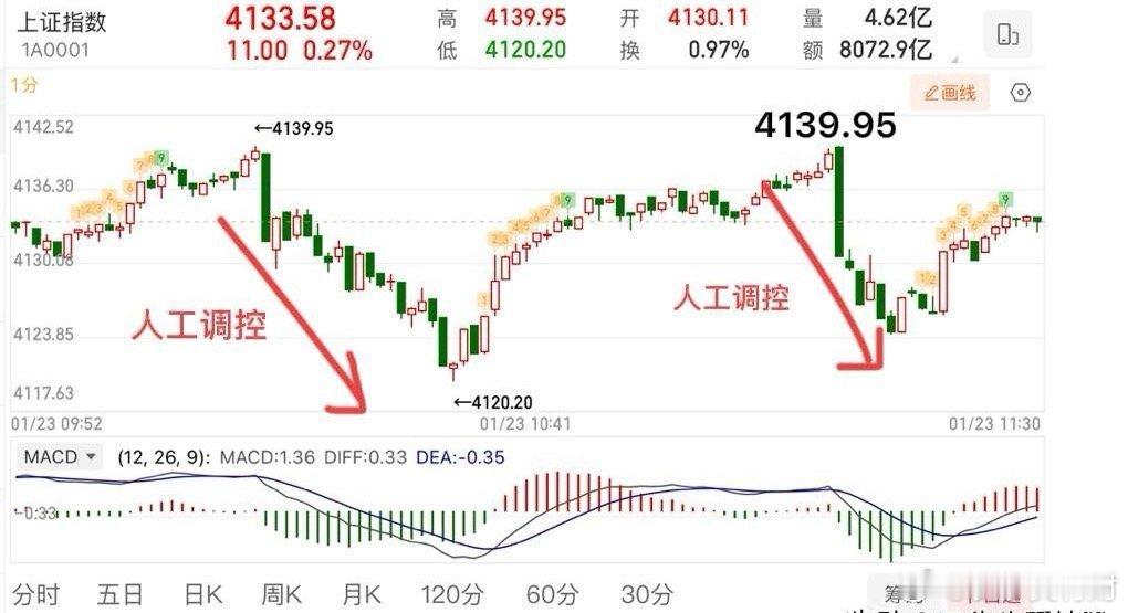 2026.1.23周五午评: “降温”也难以抑制市场的“热情”。 周五早盘延续震荡,本质不变,还未选择方向,最高点4139.95,并且两次同时打到4139.95,如图所示,实际上还是打到了4140压力附近,随后盘中沪深300ETF,上证50ETF继续压盘控温,控盘程度还是非常精准。不过即使是这样,个股走的还是非常强的,中证2000指数代表的小盘(图4),实际上已经创了前高,这就说明,市场一边“降温”,但个股“热情”不减,走的比指数是要强的。 技术面看,指数没啥好说的,等方向选择,这个位置向上的唯一条件就是,突破站稳4140且伴随成交量放大,那么往上再去挑战4200点。达不到这个条件,那就继续横盘震荡,往下关注20日线的得失。 震荡盘,重在板块个股和节奏!前两天就讲过,半导体回调的时候,资金会回流商业航天,AI应用,所以半导体涨的时候,不要去追,反向思维,关注调整的方向,商业航天也提示过第一次回踩20日线附近会有支撑反弹。像这种强势板块,不会这么结束的,还会有资金来回反复。包括AI应用,远远没有走完,也给大家讲过会有反弹,压力在颈线附近,大家可以多关注留意内部个股机会。 个人观点,仅供参考!