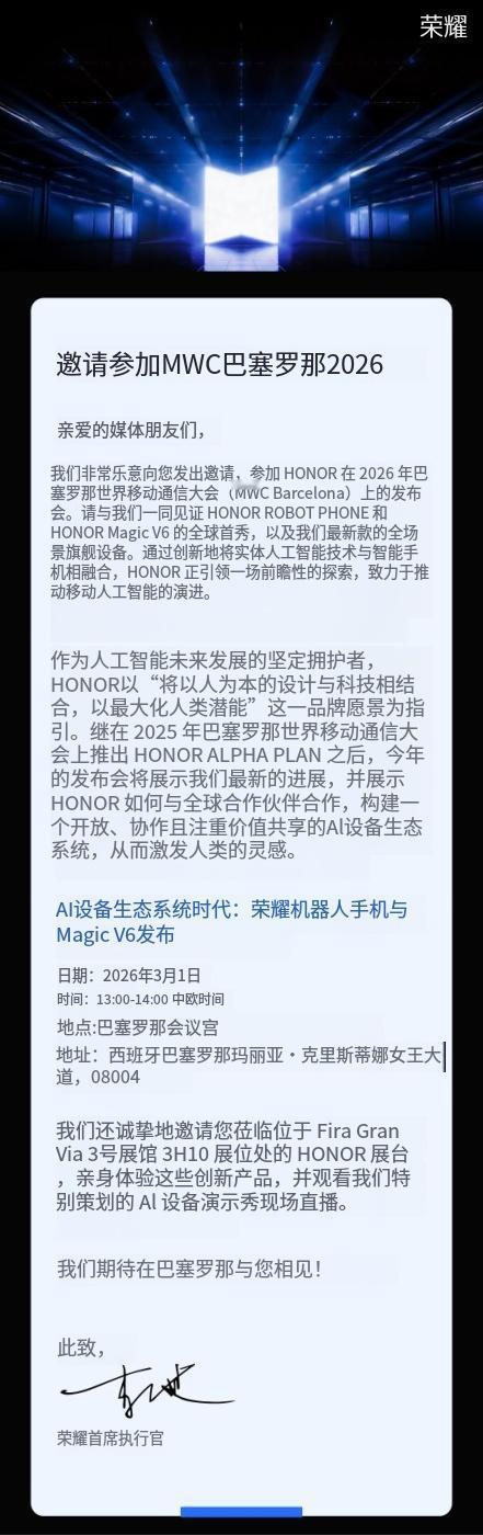 荣耀 Magic V6 和荣耀 ROBOT PHONE 官宣将在 MWC 首秀,具体时间是中欧时间 3 月 1 日 13:00(北京时间 3 月 1 日 20:00),Fira Gran Via 3 号展馆 3H10 展位。