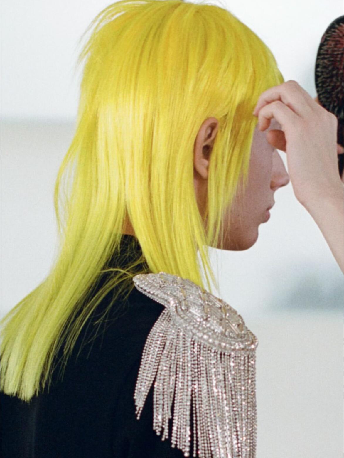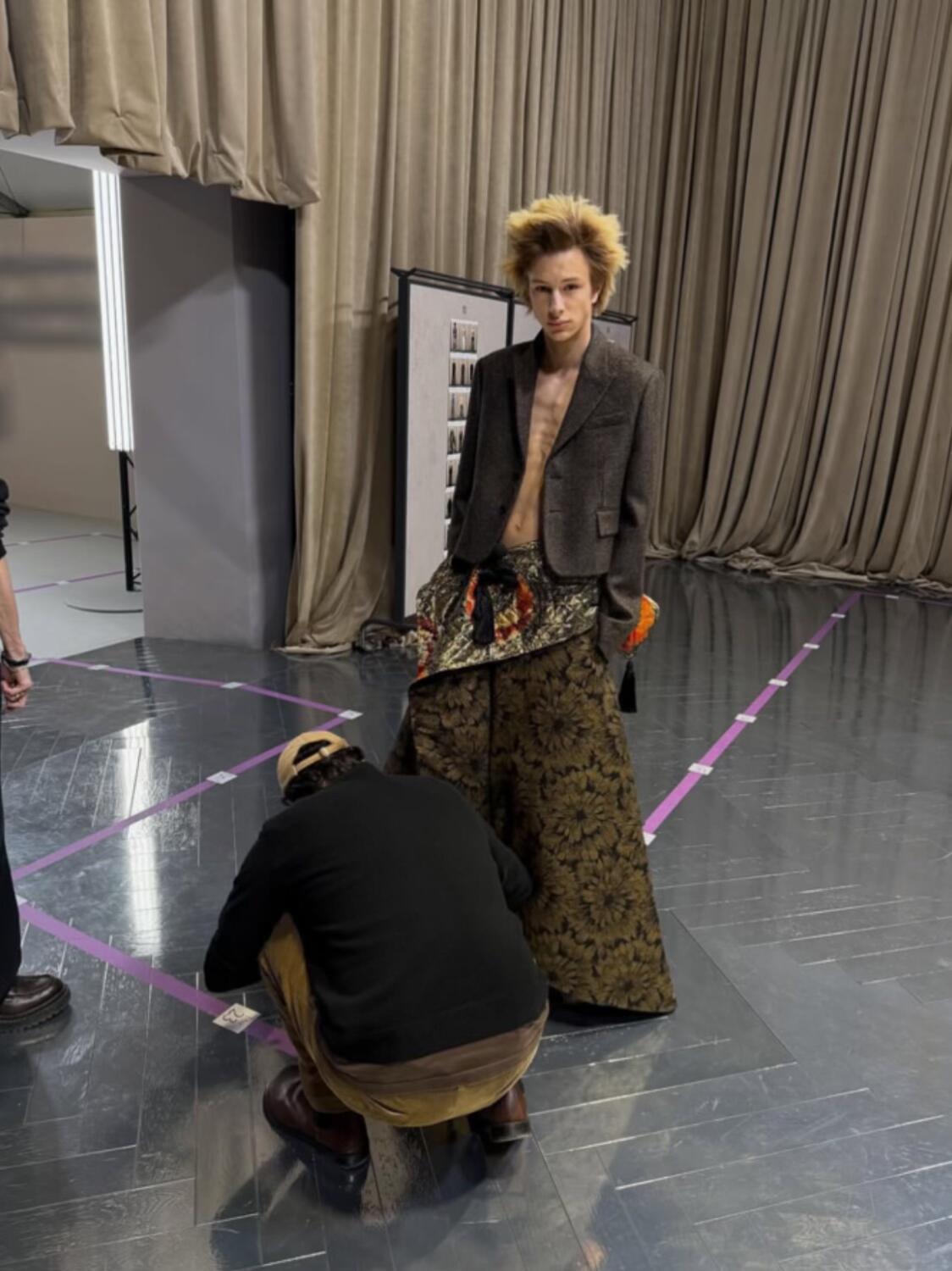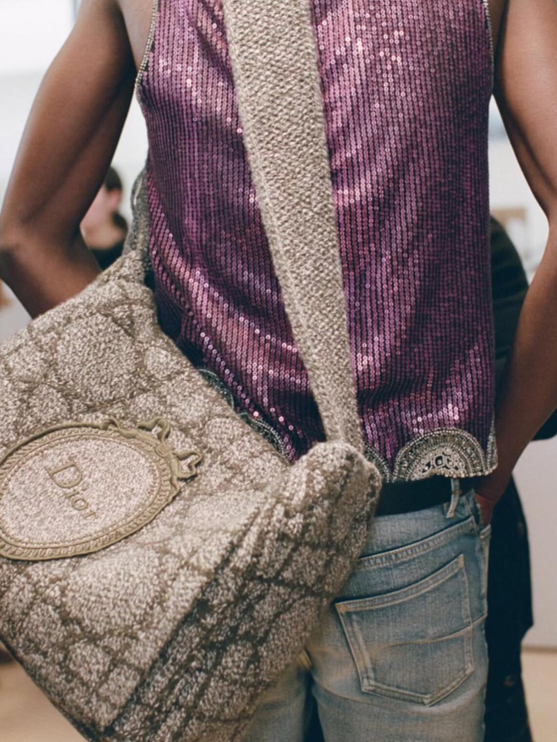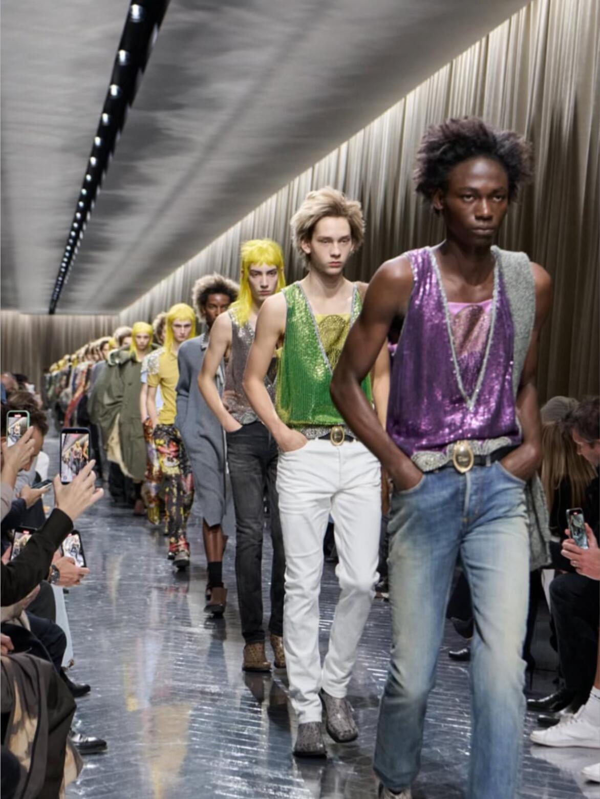 DIOR大秀男装周巴黎男装周Jonathan Anderson接棒Dior后的首场大秀,直接把巴黎时装周玩成了迪斯科派对。秀场用垂坠的金属幕布打造出未来感隧道,灯光一照,冷冽的金属光泽瞬间变成流动的霓虹星河,复古迪斯科和未来感无缝衔接,时髦得不像话。衣服设计更绝,把70年代迪斯科的亮片元素玩出了新花样。电光紫、荧光绿的亮片背心,混搭硬朗牛仔和挺括军装外套,华丽又松弛。Oversize风衣被做得更轻盈,搭配紧身亮片内搭,“软硬兼施”的剪裁,既有Dior的优雅,又带点叛逆劲儿。模特的金发乱乱的,配饰做旧,手还随意插在口袋里,主打一个“不费力的时髦”,彻底打破了高级时装的距离感。这套穿搭直接给打工人指明了方向:下班脱掉西装,换上亮片背心和牛仔外套,就能直接去蹦迪,完美实现“去班味”自由。