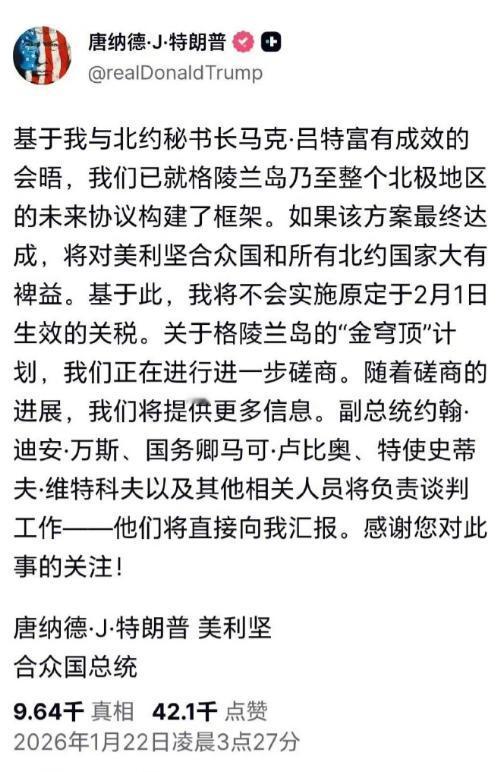 我觉得特朗普这次是怂了,欧洲议会宣布冻结2025年美欧贸易协议的审议,狠狠打了他一棍子,威胁到他2025年贸易战的“成果”,让他感到压服欧洲没那么容易。 他2026年1月21日先是宣布不会使用武力夺取格陵兰岛,接着又宣布不会将威胁欧洲的新关税付诸实施,他连着退了两大步。既然他承诺不动武了,连关税也不加了,那么欧洲还怕他个球!拖着他就是了。 欧洲议会这一冻,直接掐住了他2025年忙活大半年的贸易战命脉,那协议里藏着他想靠关税胁迫欧洲让步的不少好处,现在审议一停,之前的折腾基本等于白费功夫。他本来想拿欧洲立威,彰显自己的强硬风格,结果没料到欧洲居然敢直接硬刚,这一下就让他骑虎难下了。 要知道特朗普之前的姿态摆得有多足,2026年1月21日还在社交媒体上放话,说控制格陵兰岛的目标“不可逆转”,被问起会不会动武时也含糊其辞,故意留着威慑的余地。同时还放出狠话,要从2026年2月1日起,对反对他夺岛计划的8个欧洲国家加征关税,一副不服就打的架势。 结果才过了一天,到1月21日达沃斯论坛上就彻底改口,说自己没必要、也不愿意动用武力,关税也暂时不加了,还嘴硬说和北约秘书长定了什么协议框架,说白了就是找台阶下。 他这两步退得一点都不冤,欧洲早就摸透了他的套路。格陵兰岛是丹麦的自治领地,欧洲这边反应极快,丹麦不仅明确说不会谈移交的事,还往岛上派了士兵参加演训,格陵兰岛自治政府甚至直接给居民发了应急手册,让大家备好五天的物资,连狩猎武器都列入了储备清单,摆明了就是不怕他的武力威胁。 欧盟那边也没松口,就算特朗普松了关税,还是按计划开紧急峰会,摆明了要把主动权攥在自己手里。 特朗普之所以不敢硬刚到底,核心还是家里后院起火,实在没精力两头开战。2025年他上台后折腾的对华制裁没占到便宜,中国不仅冻结了美国国防企业资产,还收紧了稀土出口,这东西是美国军工和新能源产业的命脉,直接卡得美企难受。 国内光伏产业因为反倾销税成本暴涨,企业界怨声载道,不停游说国会放松管制,白宫内部还吵成一团,副总统和国务卿在外交方案上唱反调,国防部长那边也风波不断,整个团队执行力差得离谱。 除此之外,党内分裂越来越严重,共和党在众议院的多数席位本就脆弱,议长还被自己人围攻,甚至出现了退党潮。移民执法引发的抗议从明尼苏达蔓延到全国,民主党抓住机会联名弹劾国土安全部长,还憋着劲儿要找理由弹劾特朗普本人。 民调显示四成多民众不满他的处理方式,支持率一直在四十左右徘徊,中期选举临近,他根本不敢再在欧洲问题上惹麻烦,生怕彻底丢了选民支持。 欧洲就是看透了他这层软肋,才敢果断冻结协议、硬刚到底。现在特朗普退了两步,等于把手里最有威慑力的两张牌都废了,欧洲自然没什么好怕的。 拖着他对欧洲只有好处,一来能慢慢磨掉特朗普的耐心,二来可以等美国国内局势再变化,说不定还能争取到更有利的贸易条件。丹麦外长也直接点破,别看特朗普嘴上说不动武,夺岛的野心一点没减,这种时候更不能急着妥协,拖着就是最稳妥的办法。 特朗普这辈子就爱靠极限施压刷存在感,可这次碰到欧洲和国内的双重压力,再硬的底气也耗光了。他以为欧洲会像以前那样服软,没想到人家直接掀桌子,再加上自己国内一堆烂摊子没人收拾,只能乖乖让步。 欧洲现在就是吃定了他没精力再搞事,你不施压,我就拖着,看谁耗得过谁。毕竟主动权已经到了欧洲手里,特朗普再想找回场子,恐怕也没那个资本和精力了,这波怂得是明明白白,一点反驳的余地都没有。