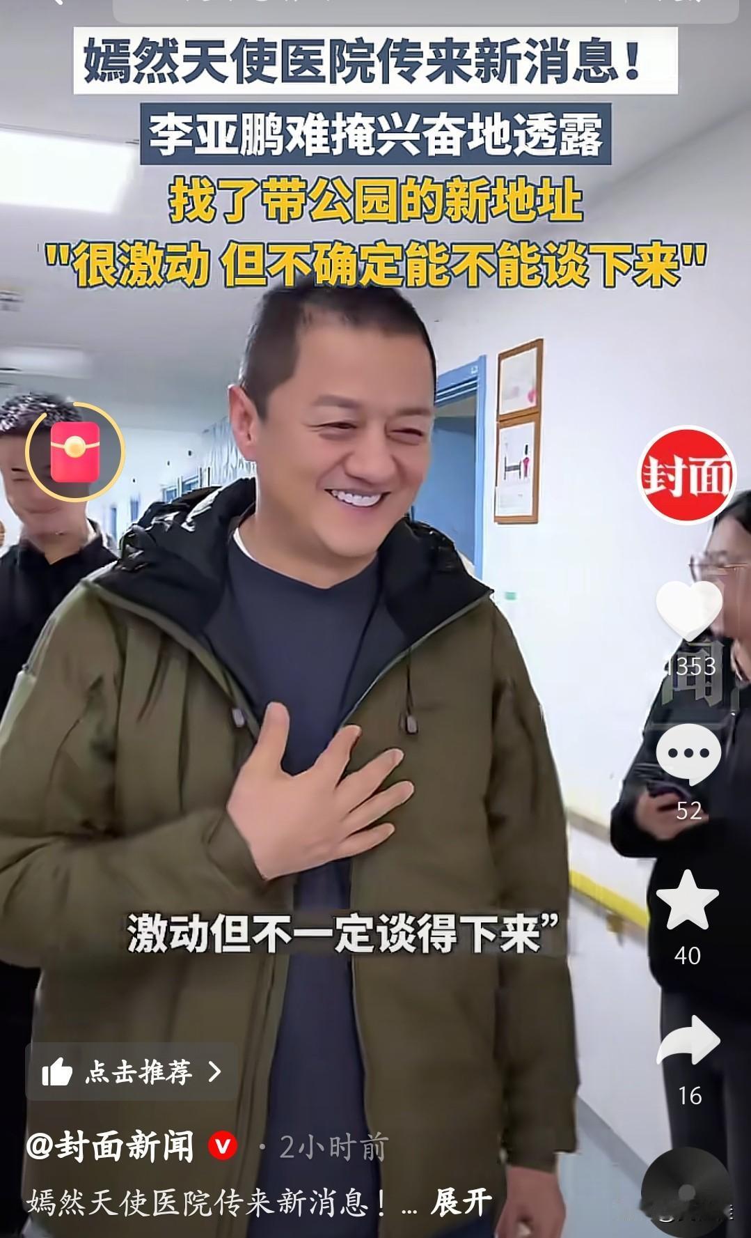 希望谈下来!嫣然天使医院的新址消息,让李亚鹏笑得像个孩子。他说找到了带公园的地方,语气里满是藏不住的激动,却又忍不住念叨“不确定能不能谈下来”。 这些年,他为了这群唇腭裂孩子操碎了心。从四处奔走筹款,到一次次为孩子主刀,医院就像他的另一个家。如今能有个带公园的新地址,意味着孩子们术后能在花园里跑跳、晒太阳,不用再挤在狭小的空间里。 镜头里,刚做完手术的孩子戴着纱布,却笑得格外灿烂。对他们来说,这不仅是医院的新家,更是能让他们自信微笑的起点。李亚鹏心里清楚,只要能给孩子们一个更好的环境,哪怕谈判再难,他也得咬牙扛住。 大家一起为嫣然天使医院加油,盼着这个带公园的新家能早日落地,让更多孩子在阳光下自由绽放笑容。